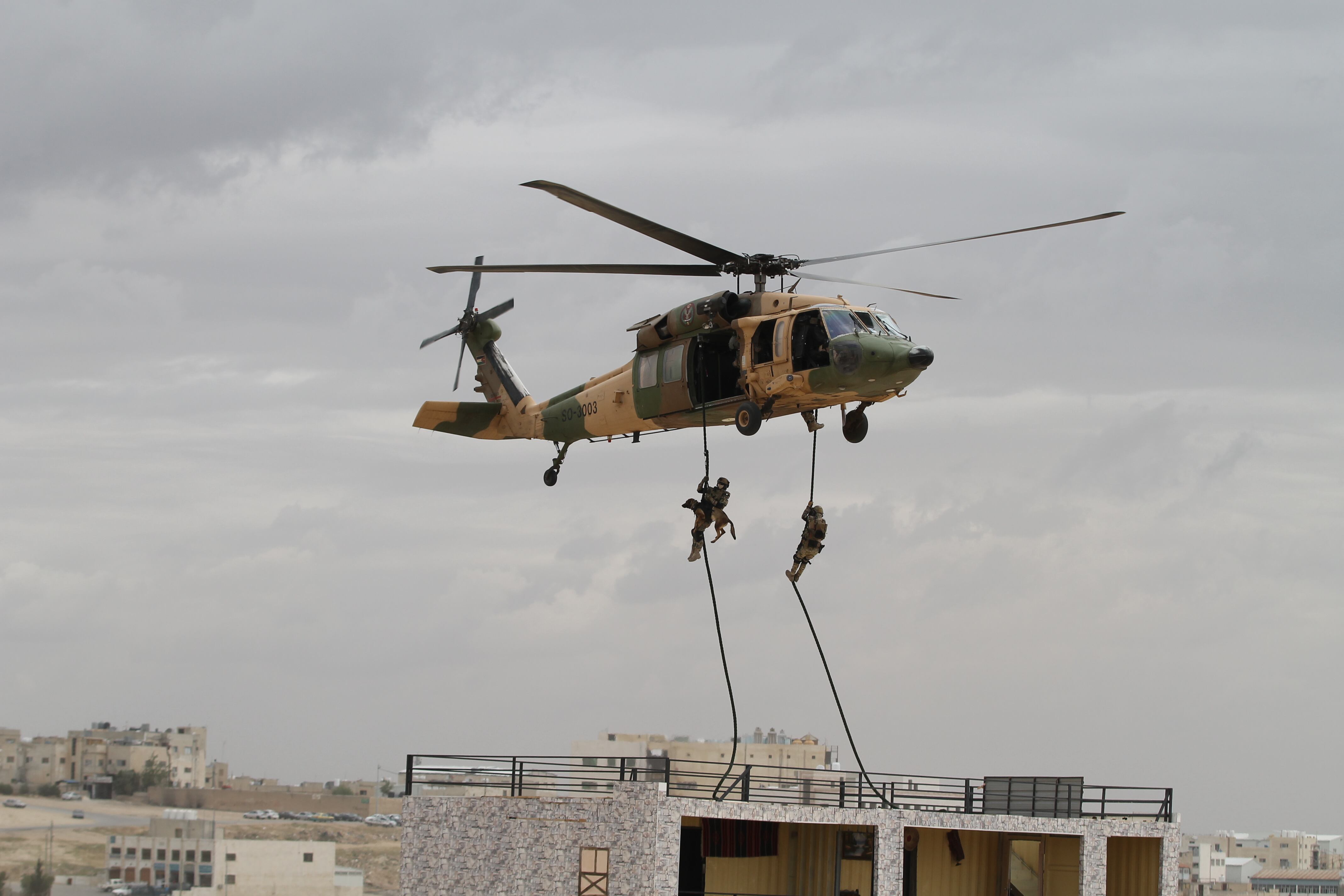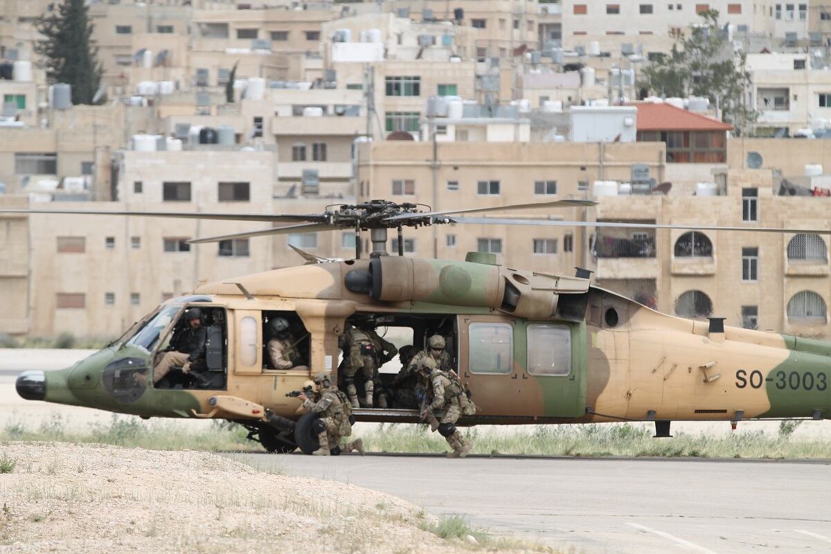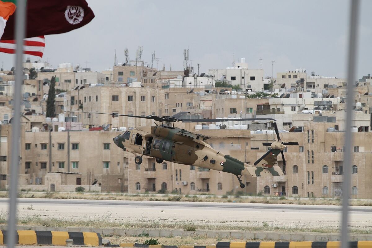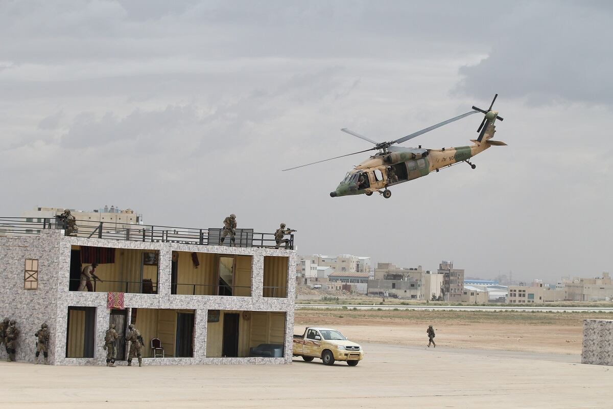 The Jordanian Royal Guard await the arrival of King Abdullah II at the first day of the Special Operations Exposition in Amman, Jordan, prior to a major military demonstration of the country's special forces capability. (Photo by Jen Judson/Defense News staff)Some Jordanian Royal Guardsmen stand on a runway preparing to greet the King of Jordan's vehicle as it arrives at SOFEX. Jordan has held the expo 12 times every other year to bring special operators throughout the Middle East and the rest of the world together. (Photo by Jen Judson/Defense News staff)The United States Special Operations Command commander Gen. Raymond Thomas arrives on the scene at SOFEX to witness the demonstration. He spoke at the Middle East Special Operations Commander Conference (MESOC) on May 7 just prior to the start of the exposition on how special operators can come together in the Middle East to better counter regional threats. He toured the show following the demonstration. (Photo by Jen Judson/Defense News staff)King Abdullah II stands on a stage overlooking his guardsmen prior to the demonstration of his forces. King Abdullah has championed SOFEX over the years having commanded Jordan's Special Forces. He became a major general in 1998. (Photo by Jen Judson/Defense News staff)Against the backdrop of Amman, the Jordanian Royal Guard exist the demonstration area to clear the way for the mission to begin. To kick off the demonstration, a 21-gun salute rang out across the airfield. (Photo by Jen Judson/Defense News staff)Over the loud speakers, it is announced that insurgents are hiding in a village and have been found by security forces. Pathfinders drop in from an overcast sky, beginning the mission to take out the insurgent stronghold. (Photo by Jen Judson/Defense News staff)A Jordanian UH-60 Mike-model Black Hawk utility helicopter lands on the outskirts of the simulated insurgent hideout to inject special operators to move in on the target. (Photo by Jen Judson/Defense News staff)Special forces prepare rappel from a UH-60 L-model Black Hawk above the roof of an insurgent infested hideout. (Photo by Jen Judson/Defense News staff)As insurgents hide below, special forces, including a military working dog, stealthily drop to the roof from the UH-60L. (Photo by Jen Judson/Defense News staff)The special forces begin their infiltration of the insurgents' lair from the ground and from the roof as a Black Hawk hovers over head. (Photo by Jen Judson/Defense News staff)Jordanian special forces search for insurgents throughout the building as a firefight ensues. (Photo by Jen Judson/Defense News staff)A Jordanian SOF AH-1F Cobra provides cover to the operators on the ground during the mission to take out the insurgents. (Photo by Jen Judson/Defense News staff)A Jordanian AH-6i Little Bird, which is also used prominently by U.S. Special Operations Forces, passes overhead as a firefight culminates on the ground with insurgents getting captured or killed. (Photo by Jen Judson/Defense News staff)A Jordanian Super Puma flies over the action. (Photo by Jen Judson/Defense News staff)A Jordanian Black Hawk looms overhead as it prepares to extract an injured SOF operator from the intense firefight below. (Photo by Jen Judson/Defense News staff)After a wounded SOF operator is evacuated via a different Black Hawk, a unit prepares to move out after accomplishing the mission of driving insurgents out of their safe haven and capturing the survivors among them. (Photo by Jen Judson/Defense News staff)With special operators in tow, the Black Hawk takes off over the Amman sky line. (Photo by Jen Judson/Defense News staff)As the demonstration came to a close, Jordanian helicopters flew by bearing the flag of Jordan, the Jordanian special forces flag and a SOFEX flag. (Photo by Jen Judson/Defense News staff)