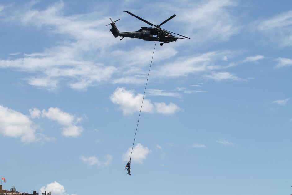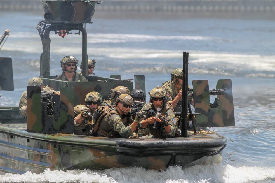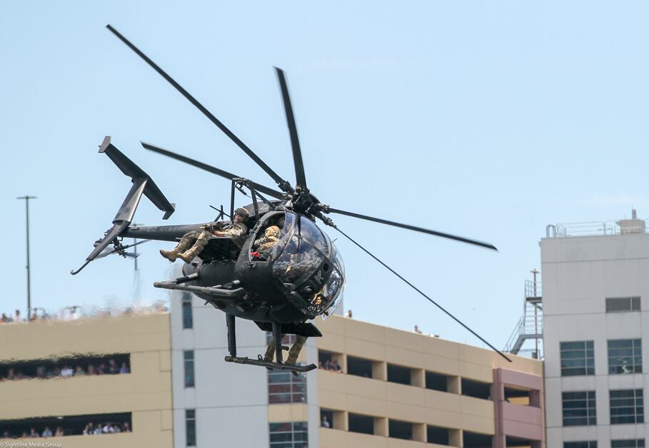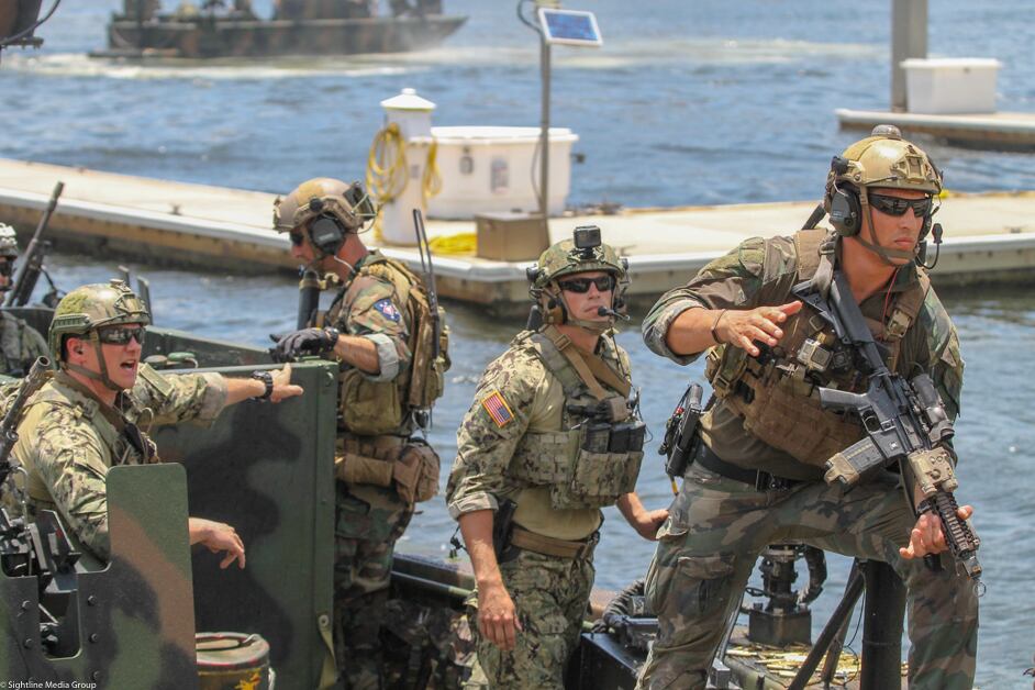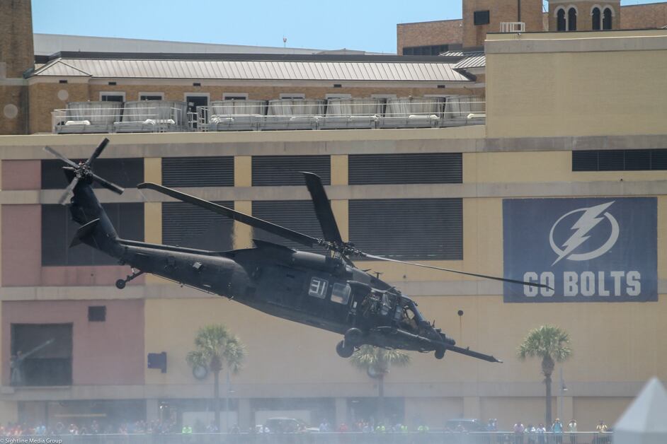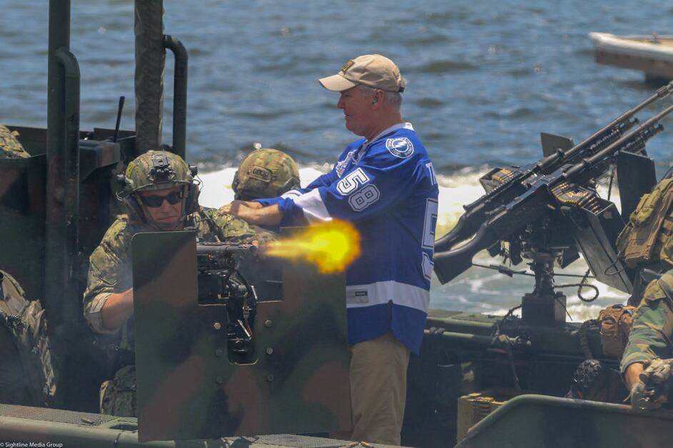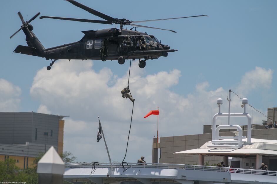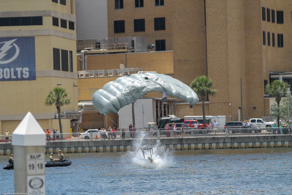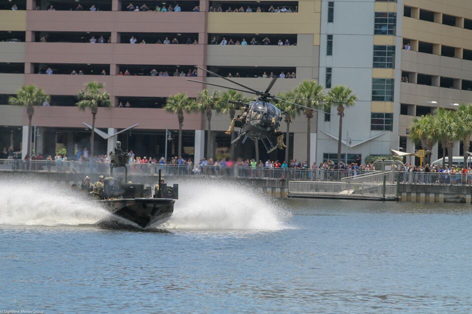 At the start of the demonstration, a hostage – Tampa Bay Mayor Bob Buckhorn – is taken from the Yacht StarShip and moved ashore to a small mock village overrun by the enemy. (Photo by Jen Judson/Defense News staff)A combat rubber raiding craft carrying special operators from Poland, Singapore and the U.S., inserts sub-surface swimmers near the yacht. The operators separated into two teams and moved underwater to positions on the bottom of the channel waiting to move in on the yacht and to eliminate an enemy sentry on the dock in front of the Tampa convention center. (Photo by Jen Judson/Defense News staff)An MH-60 Black Hawk helicopter with special operators from Colombia and the U.S. conduct a helocast insertion into the channel using a combat rubber raiding craft. (Photo by Jen Judson/Defense News staff)The MH-60 Black Hawk inserts a combat rubber raiding craft with a motor strapped to the bottom of the helicopter using a series of complex tie-downs. An operator jumps in the water, swims to the boat, and then mounts the engine, a very difficult task considering operators have to lift the engine into place while wearing all their gear. (Photo by Jen Judson/Defense News staff)Two MH-6 Little Bird helicopters carrying special operators establish a support-by-fire position as well as a sniper position overlooking the enemy camp in the village. Operators sit on external seats as the aircraft approaches the drop-off points. This allows the operators to quickly dismount and mount the helicopters as well as give them an unobstructed view of the battlefield. (Photo by Jen Judson/Defense News staff)Using intel that the hostage is still on the yacht, one of the dive teams emerge at the back of the vessel and begin a climb quietly up the side of the ship after a diversion is set off -- an explosion detonated on a small pontoon next to the yacht toward the front of the ship. (Photo by Jen Judson/Defense News staff)An MH-60 Black Hawk helicopter approaches the yacht with special operators from Colombia, Finland, Poland, Singapore, and the U.S. The helicopter assault force execute a fast-rope infiltration onto the yacht. Once on board, the assault force quickly secures the ship and begins searching for the hostage. (Photo by Jen Judson/Defense News staff)Discovering the hostage is not on the yacht, but ashore in the village, a boat assault force enters the scene aboard two Special Operations Craft – Riverine or SOC-R. This force consists of personnel from Colombia, Finland, Poland, and the U.S. and a member from the FBI. Their mission is to eliminate enemy resistance in the vicinity of the village, rescue the hostage, and gather valuable intelligence before departing the area. MH-6 Little Birds provide armed escort throughout the assault. (Photo by Jen Judson/Defense News staff)Special forces approach the shore where the hostage appears to be held, opening fire on the enemy as they approach. (Photo by Jen Judson/Defense News staff)Operators prepare to take the hostage aboard once rescued from the village. (Photo by Jen Judson/Defense News staff)A special operator prepares to kick down the door where he anticipates the hostage is being held following an explosion at the entrance. (Photo by Jen Judson/Defense News staff)Operators, including one from Finland, rescue the hostage – Mayor Buckhorn in a Tampa Bay Lightning jersey – and prepare to move him onto a watercraft to extract him from the village. The Tampa Bay Lightning went on to lose against the Washington Capitals in a home game during the Stanley Cup semi-finals later that night. (Photo by Jen Judson/Defense News staff)Once Buckhorn is brought aboard the vessel, a special operator continues to suppress enemy fire as the watercraft pulls away from the shore. (Photo by Jen Judson/Defense News staff)With the hostage secure, the commander orders all operators extracted from the area. Black Hawk helicopters return to exfiltrate the crew from the yacht using the Fast Rope Insertion and Extraction System or FRIES. This system is used for extracting personnel from areas where helicopters cannot land. Ropes are attached to the helicopter and dropped down to the personnel. A series of rings on the rope allow operators on the ground, wearing special harnesses, to clip onto the rope. (Photo by Jen Judson/Defense News staff)The Combat Rubber Raiding Craft returns to the channel where the swimmers are extracted by a Black Hawk helicopter using a caving ladder. The helicopter will typically hover about 10 feet above the water while the personnel climb the ladder. (Photo by Jen Judson/Defense News staff)To cap off the demonstration, a C-130 flies overheard with a military free-fall parachute jump team. This 7-man team, with jumpers from Colombia, Hungary, Italy, Romania, Singapore, and the United States, will jump from the aircraft at 8,000 feet and deploy their parachutes at 4,000 feet. (Photo by Jen Judson/Defense News staff)A member of the jump team prepares to land in the water below. While done in the broad daylight during the demonstration, the team normally conducts military free-fall operations in the dead of night, while fully loaded with 70 pounds of combat equipment, and wearing a special helmet and oxygen mask. (Photo by Jen Judson/Defense News staff)Each team member drops into the water roughly in the same spot, a challenging maneuver when having to wrangle a parachute. (Photo by Jen Judson/Defense News staff)
