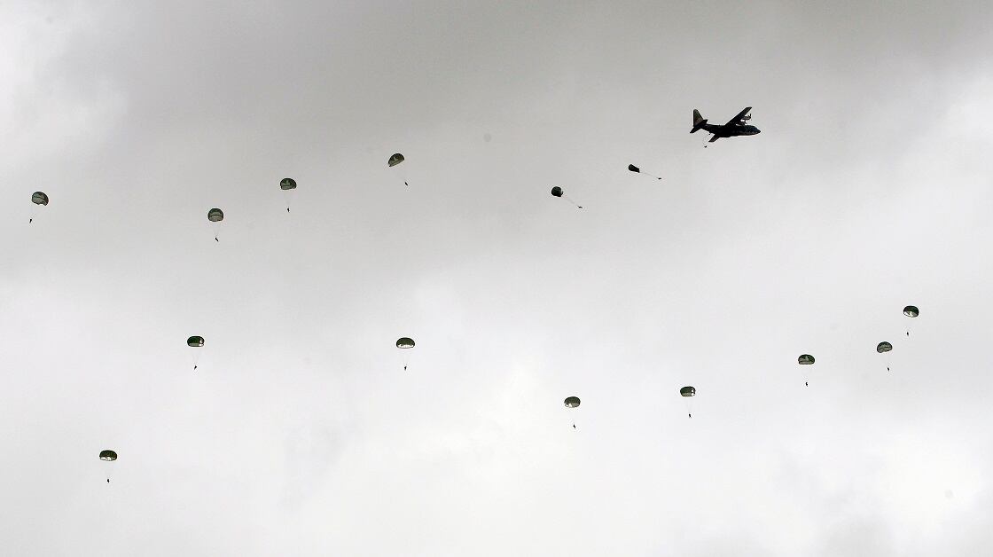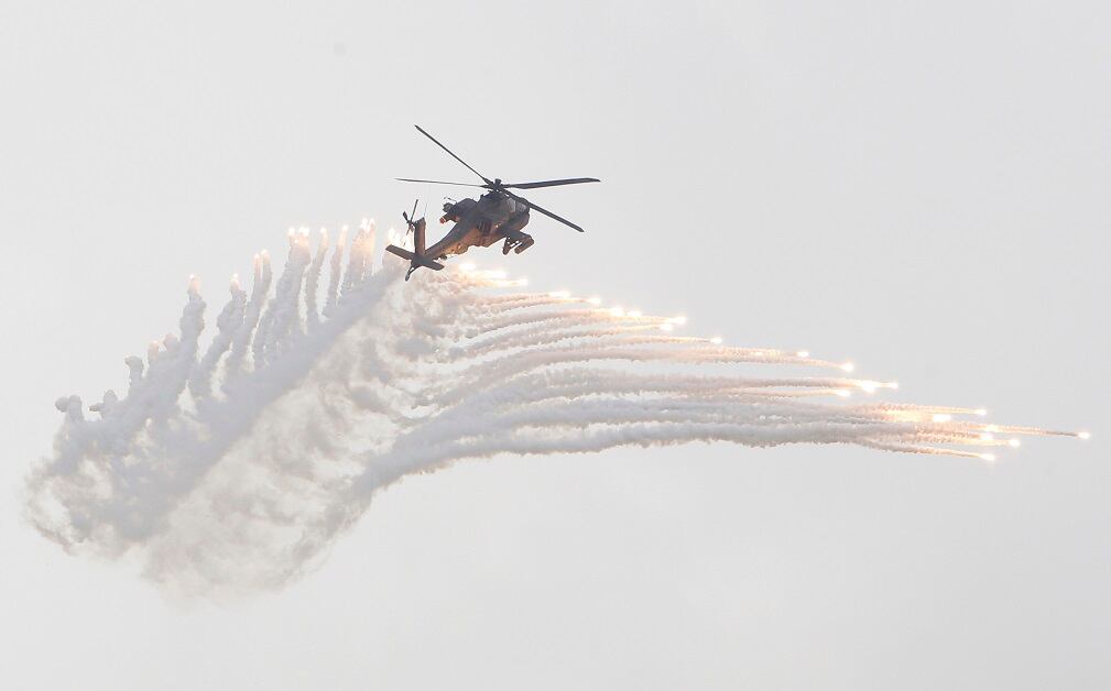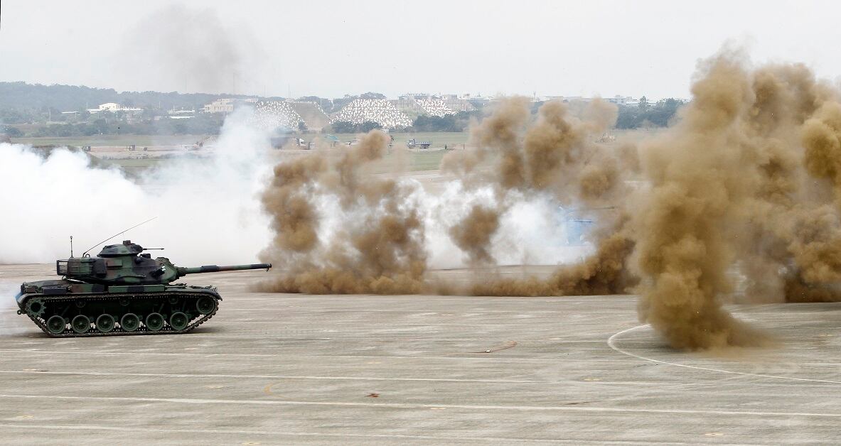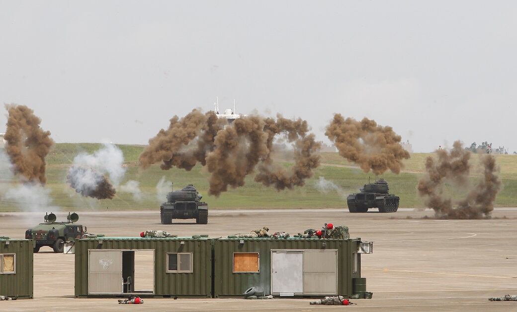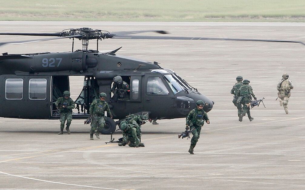 Simulating an invasion from China, Taiwanese special forces soldiers practice hand-to-hand combat during the annual Han Kuang exercises at an air base in Taichung County, Taiwan, on June 7, 2018. (Chiang Ying-ying/AP)Tanks perform drills amid heavy smoke during the Han Kuang exercises at an air base in Taiwan. Taiwan's war games are intended to display the military’s willingness and ability to fight off an invasion from China. (Chiang Ying-ying/AP)Taiwanese pilots fly American-made UH-60 Black Hawk helicopters over the annual Han Kuang war games. (Chiang Ying-ying/AP)Flares launch from a Taiwanese AH-1W Cobra attack helicopter during exercises at an air base in Taichung County, Taiwan, on June 7, 2018. (Chiang Ying-ying/AP)A pair of F-16 fighter jets display the readiness of the Taiwanese Air Force while launching flares above the Han Kuang exercises in Taiwan. Shortly before the drills began, an F-16 crashed into mountains in northern Taiwan, killing the pilot. (Chiang Ying-ying/AP)A Taiwanese tank advances while leading ground forces exercises at an air base in Taichung County, Taiwan. (Chiang Ying-ying/AP)Taiwanese airborne soldiers dot the sky as they deploy from a C-130 Hercules cargo plane. The exercise at the sprawling Ching Chuan Kang force base near the central city of Taichung was part of an annual five-day live-fire exercise featuring joint operations of the Air Force, Navy and ground forces. (Chiang Ying-ying/AP)A Taiwanese special forces unit exits a UH-60 Black Hawk helicopter during the annual Han Kuang exercises at an air base in Taichung County, Taiwan. (Chiang Ying-ying/AP)Preparing for the possibility of hostilities, tanks from Taiwan's military take part in the annual Han Kuang exercises at an air base in Taichung County, Taiwan, on June 7, 2018. (Chiang Ying-ying/AP)