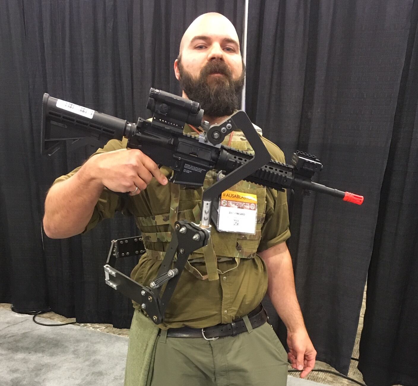 Wingard modeled the 4-pound, carbon-fiber exoskeleton during a presentation at the Association of the U.S. Army Global Force Symposium. It attaches to a soldier's back, via the tactical vest, and connects to the gun's Picatinny rail. It is ambidextrous and can mount on either side of the body.