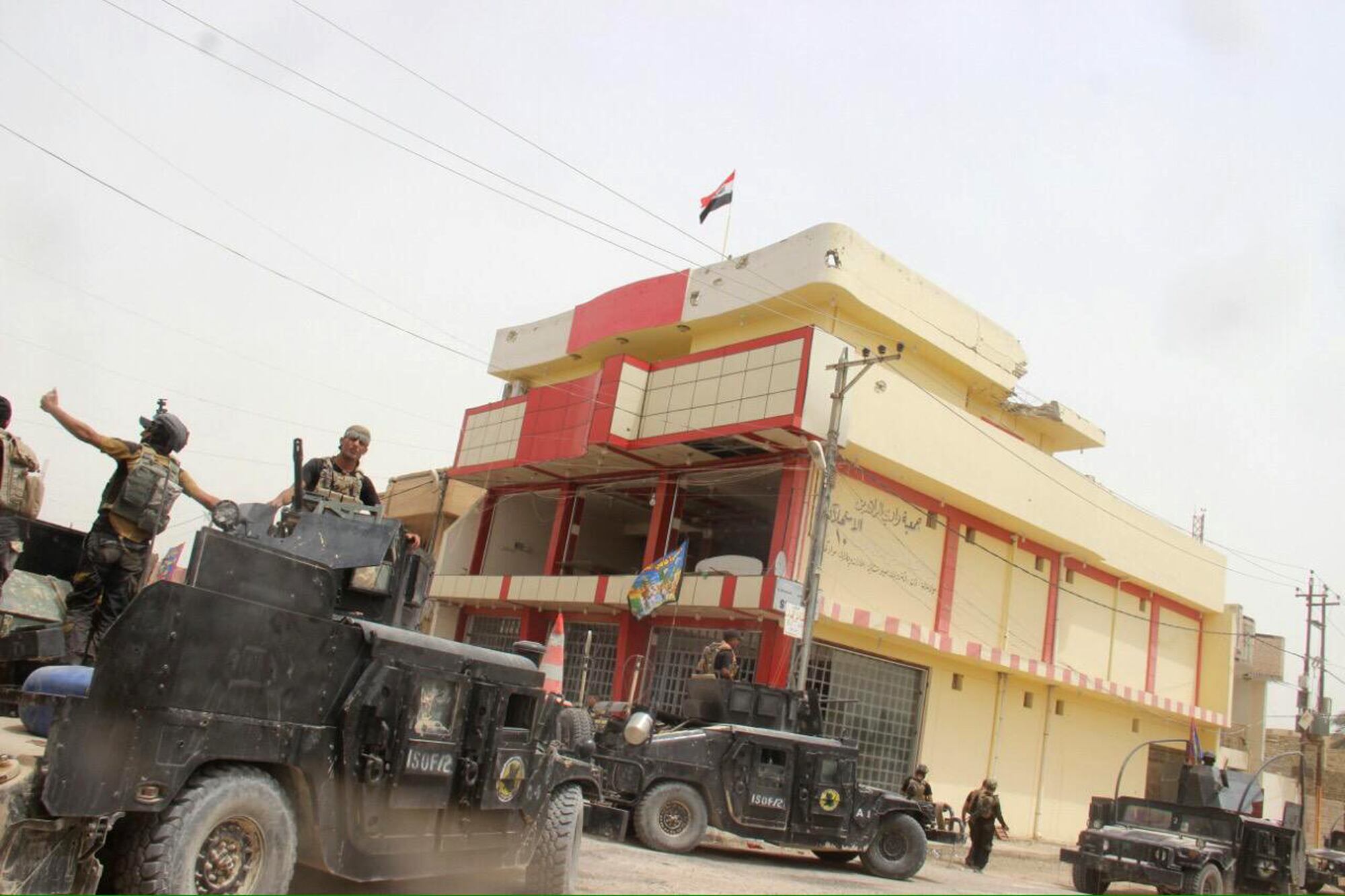 The Iraqi national flag flies over Fallujah on June 19, 2016, after forces re-took the city center after two years of Islamic State control.