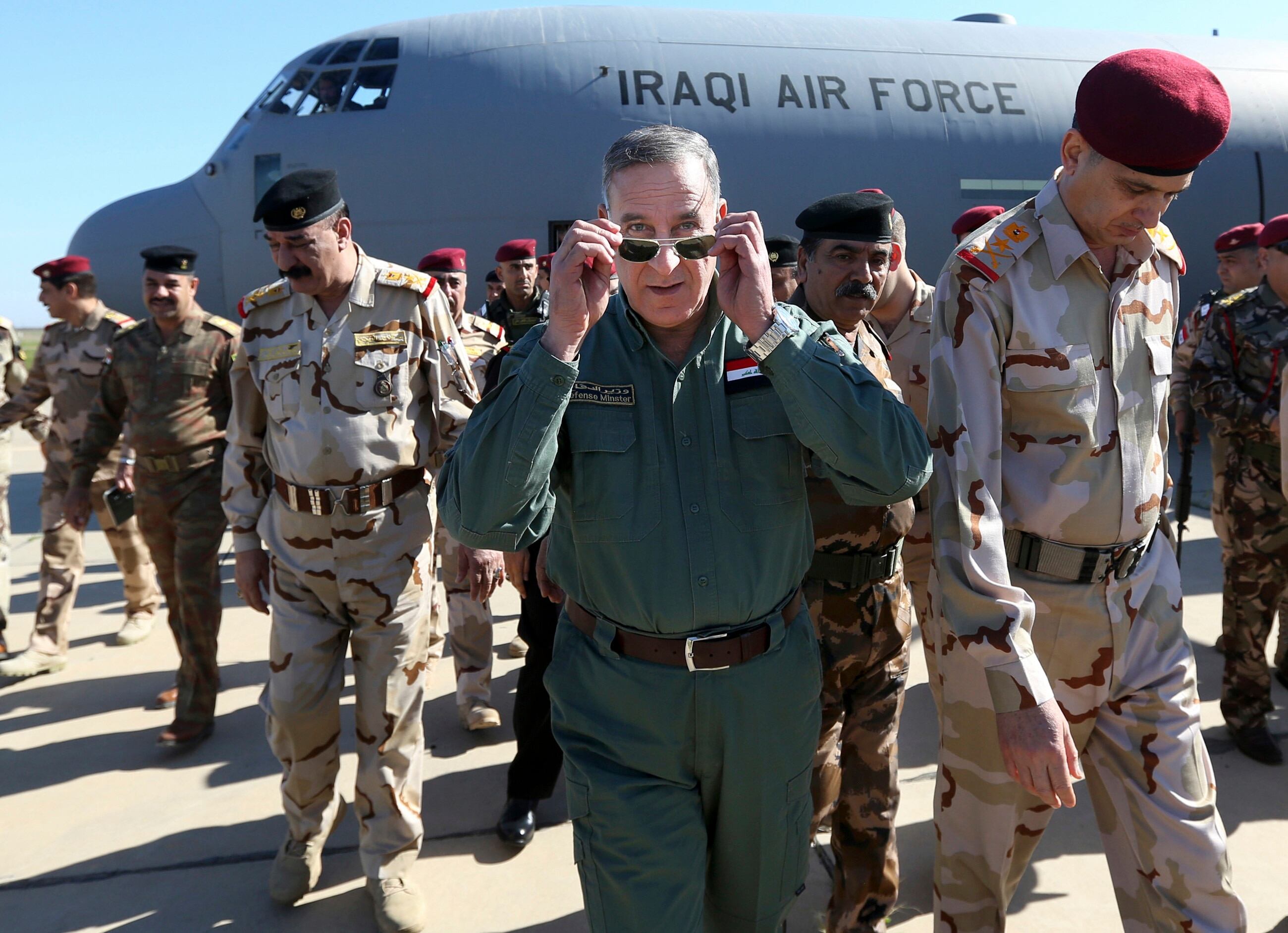 Iraqi Defense Minister Khaled al-Obeidi, center, arrives on March 9, 2016, at a military a base outside Tikrit, 130 kilometers (80 miles) north of Baghdad, Iraq. Al-Obeidi has received a no-confidence vote from parliament just as Iraqi forces retook a key northern town near the Islamic State-held city of Mosul on Thursday, Aug. 25, 2016. He is the first sitting defense minister to receive a no confidence vote from parliament since the overthrow of former Iraqi leader Saddam Hussein in 2003.
