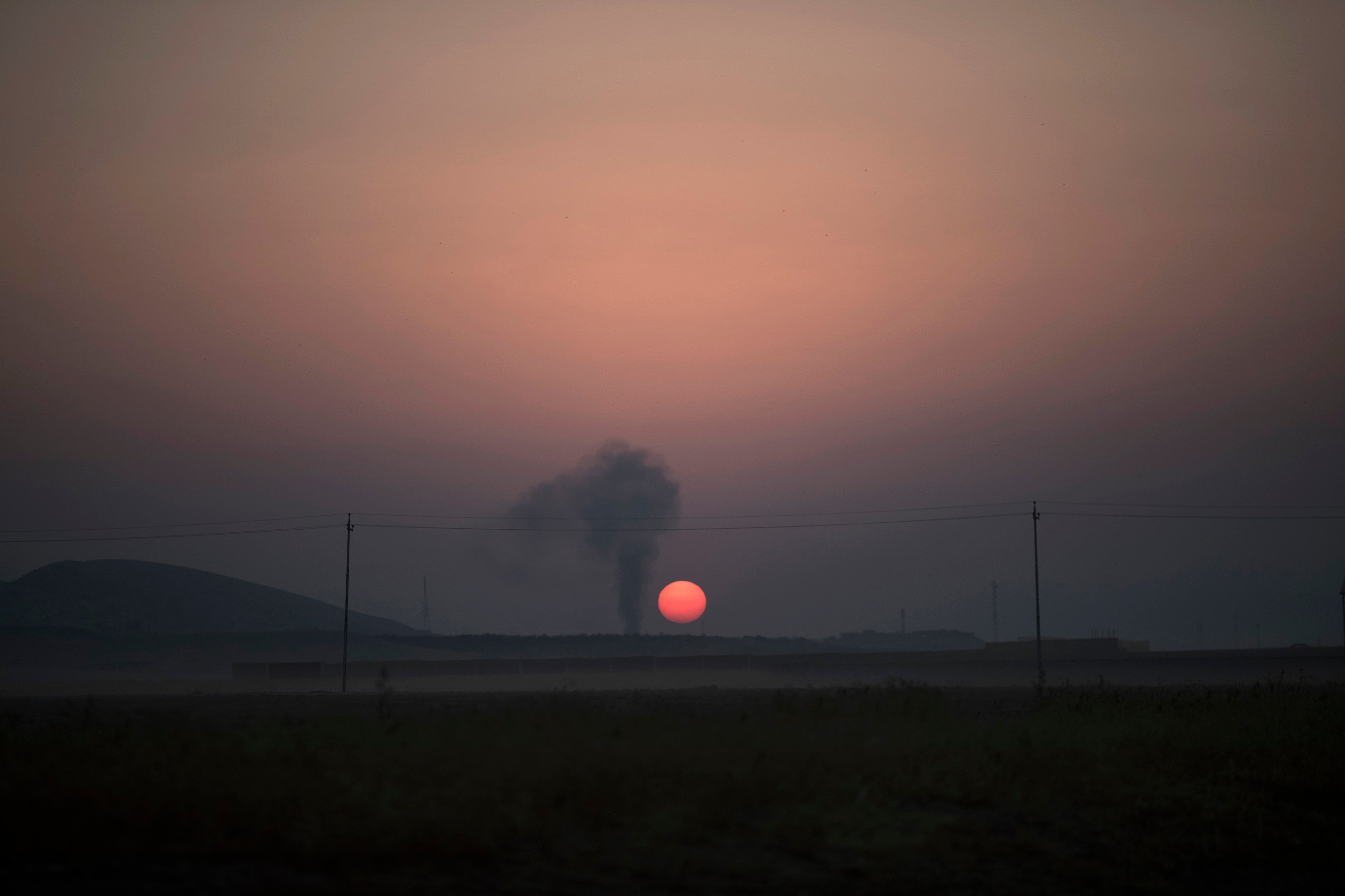 Mortar fire, automatic weapons, and explosions rang out through the morning, as a thick plume of smoke hung over parts of the town, obscuring the view of aircraft.