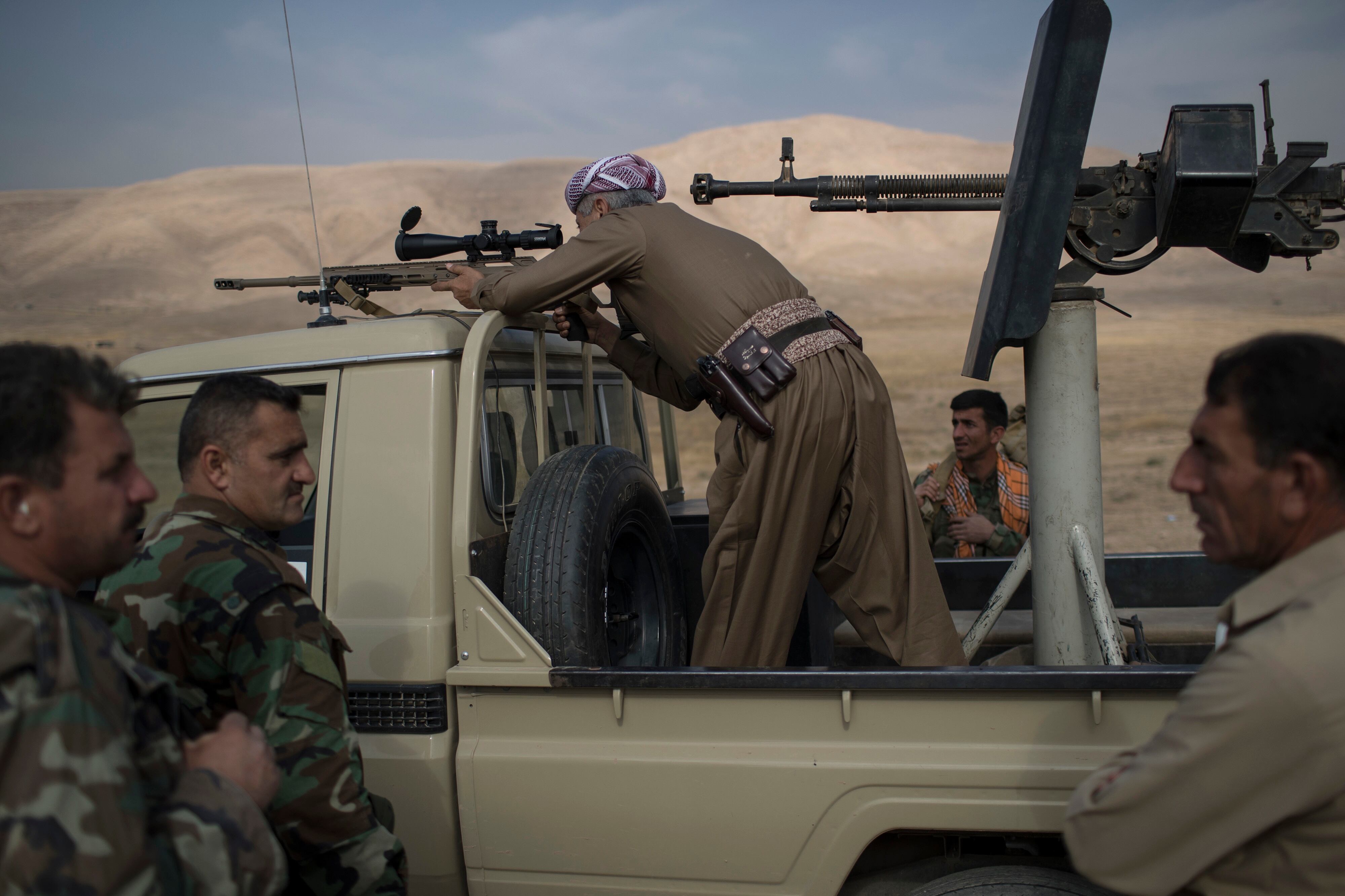A Kurdish peshmerga fighter looks at Islamic State militant positions during heavy fighting in Bashiqa, east of Mosul, Iraq, Tuesday, Nov. 8, 2016. Iraqi troops and the Kurdish peshmerga forces are now converging on Mosul, although the deepest advance into an eastern sliver of the city has stalled after militants counterattacked advancing special forces from within built-up, populated areas.