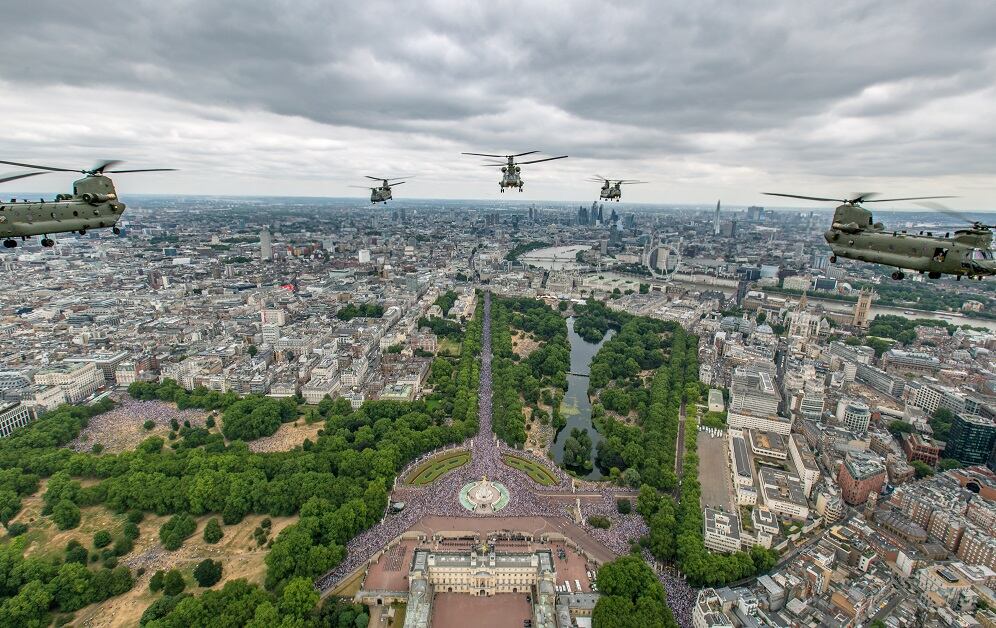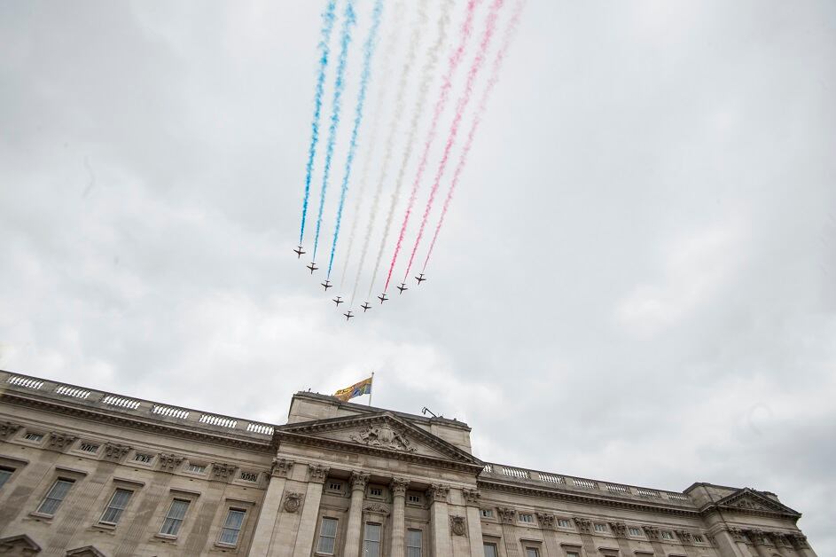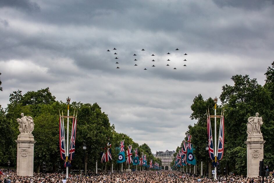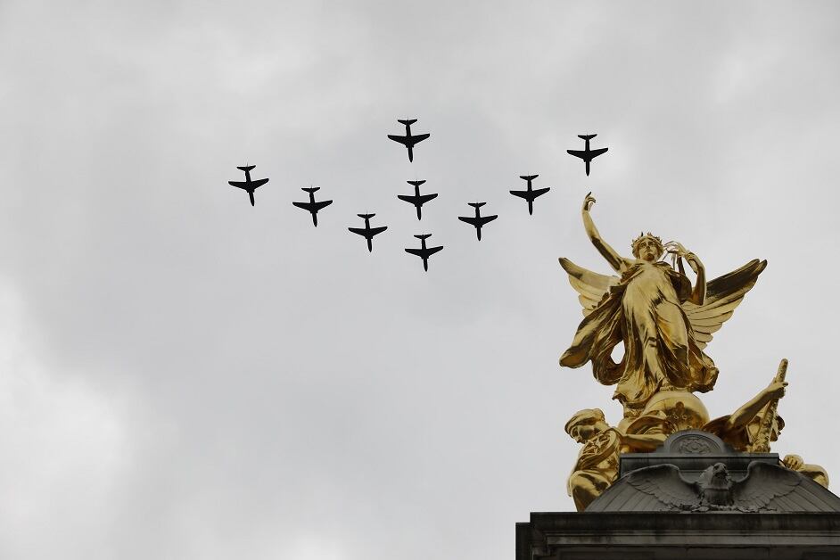LONDON, ENGLAND - JULY 10: In this handout image provided by the Ministry of Defence, Typhoon aircraft forming "RAF100" over the Mall and Buckingham Palace during RAF 100 celebrations on July 10, 2018 in London, England. A centenary parade and a flypast of up to 100 aircraft over Buckingham Palace takes place today to mark the Royal Air Forces' 100th birthday. (Photo by Ministry of Defence via Getty Images)Royal Air Force (RAF) Chinooks from RAF Odiham flew in the lead formation, along with Pumas from RAF Benson, for the RAF100 flypast through London during RAF 100 celebrations. (Photo by Ministry of Defence via Getty Images)LONDON, ENGLAND - JULY 10: In this handout image provided by the Ministry of Defence, a trio of F-35B Lightning II aircraft of 617 Squadron taking part in the RAF100 parade and flypast over Buckingham Palace during RAF 100 celebrations on July 10, 2018 in London, England. A centenary parade and a flypast of up to 100 aircraft over Buckingham Palace takes place today to mark the Royal Air Forces' 100th birthday. (Photo by Ministry of Defence via Getty Images)A Second World War Lancaster bomber and Spitfires fly in formation on the centenary of the formation of the RAF on the eighth day of the 2018 Wimbledon Championships at The All England Lawn Tennis Club in Wimbledon, southwest London, on July 10, 2018. (OLI SCARFF/AFP/Getty Images)Military aircraft form a tight formation over the Queen Victoria Memorial (QVM) on the Mall outside Buckingham Palace in London. The Queen and members of the royal family took part a series of engagements on July 10 to mark the centenary of the Royal Air Force. (TOLGA AKMEN/AFP/Getty Images)The Red Arrows take part in a fly-past over Buckingham Palace, leaving colorful smoke trails. Photo by Paul Grover - WPA Pool/Getty Images)The Royal Air Force Aerobatic Team joins the nearly 100 other planes in marking a century of RAF service. (Photo by Ministry of Defence via Getty Images)