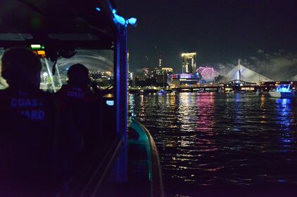 A boarding team from Coast Guard Station Boston patrols Boston Harbor during Independence Day celebrations, July 4, 2018. (U.S. Coast Guard/Petty Officer 2nd Class Lara Davis)