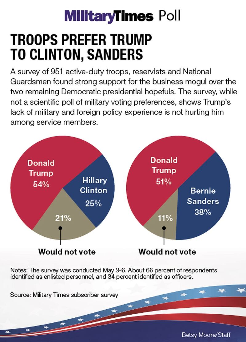 Independent Vermont Sen. Bernie Sanders fared slightly better than Clinton in a similar head-to-head matchup with Trump, but still trailed the reality TV star and business mogul by a 51 percent to 38 percent margin. AOnly about one in 10 military members said they would not vote at all given those two candidates.