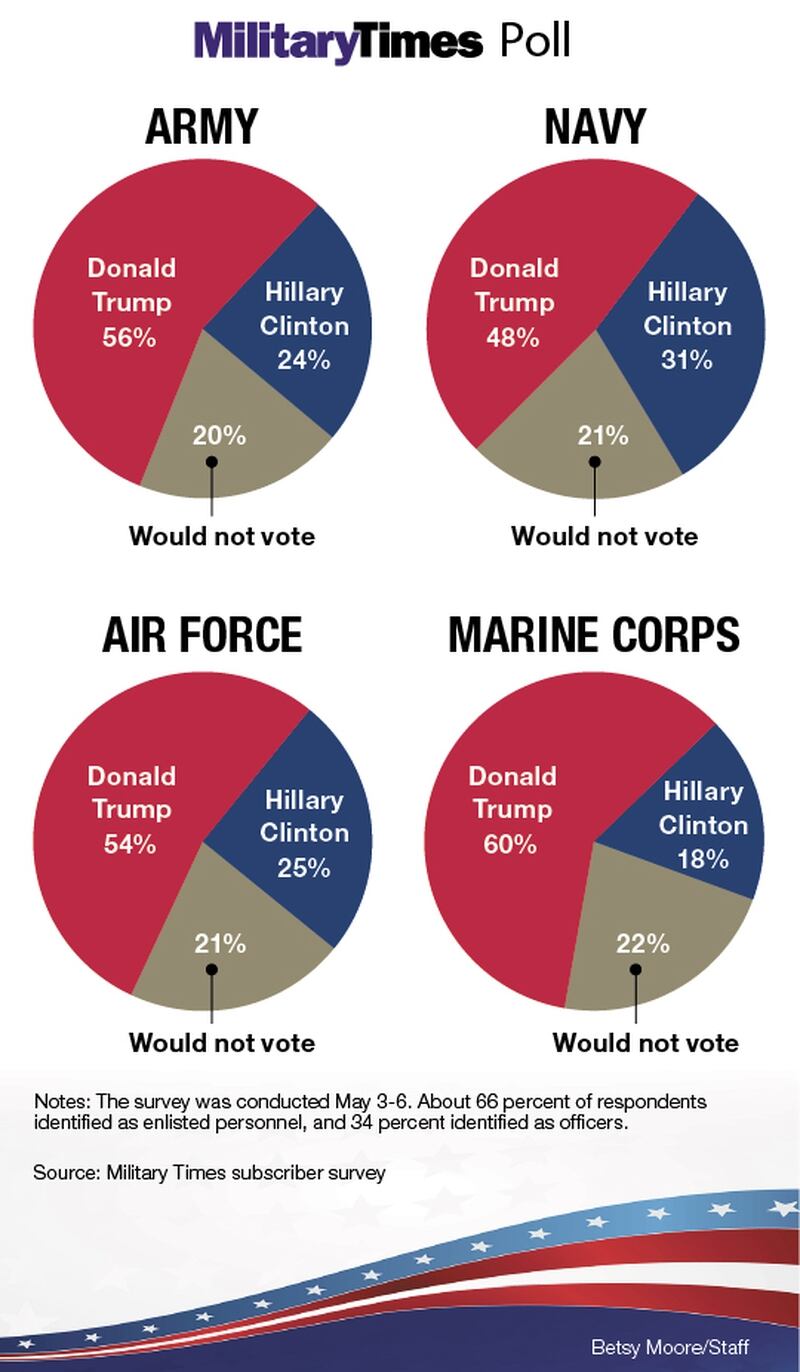 But given only those choices, 21 percent of the service members surveyed said they would opt to abstain from voting not vote at all.More than 54 percent of the 951 troops Military Times surveyed said they would vote for Trump, the presumed Republican presidential nominee, over Clinton, the Democratic front-runner. Only about 25 percent said they would vote for Clinton in that matchup.