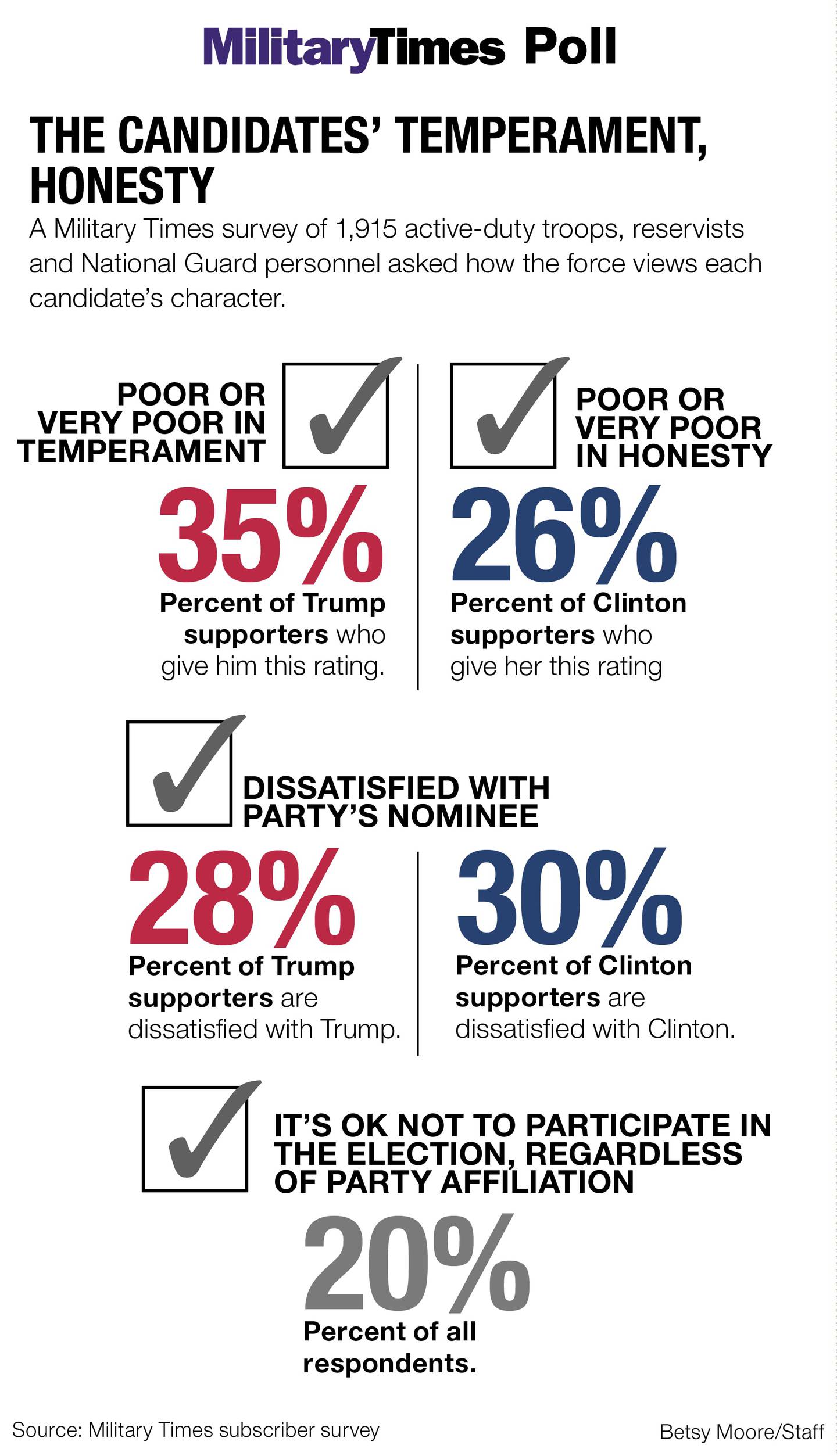 Between Sept. 8 and 15, Military Times and IVMF conducted a voluntary, confidential online survey of U.S. service members. The questions focused on the nation's current political climate, the 2016 presidential election and other relevant issues.