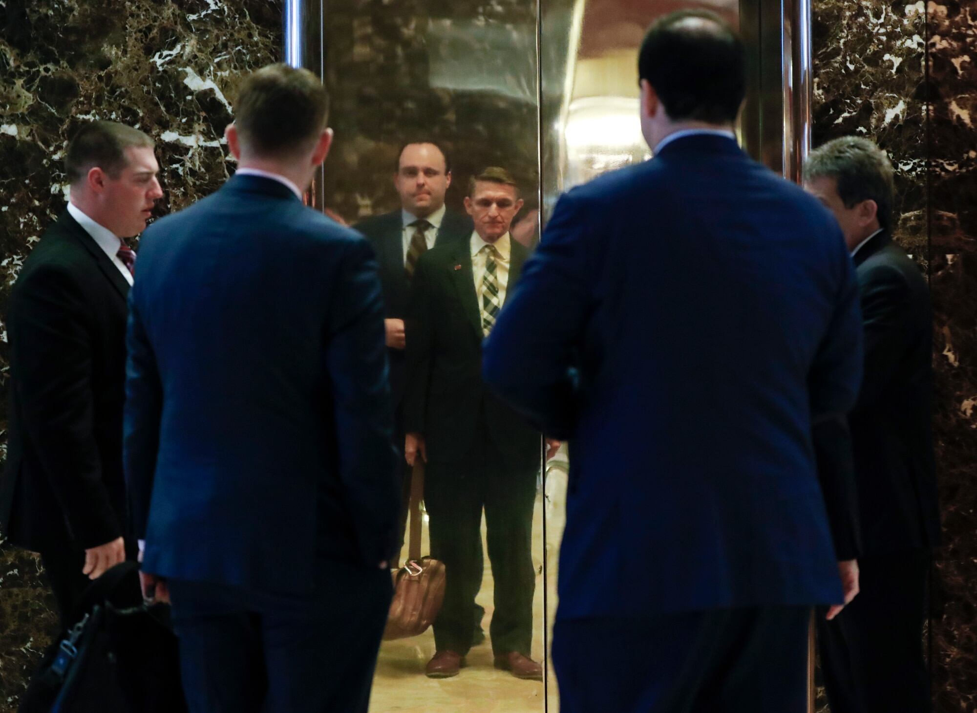 Retired Lt. Gen Michael Flynn, center right, and Boris Epshteyn, a spokesman for President-elect Donald Trump, center left, are reflected in elevator doors Flynn arrives at Trump Tower, Thursday, Nov. 17, 2016, in New York.
