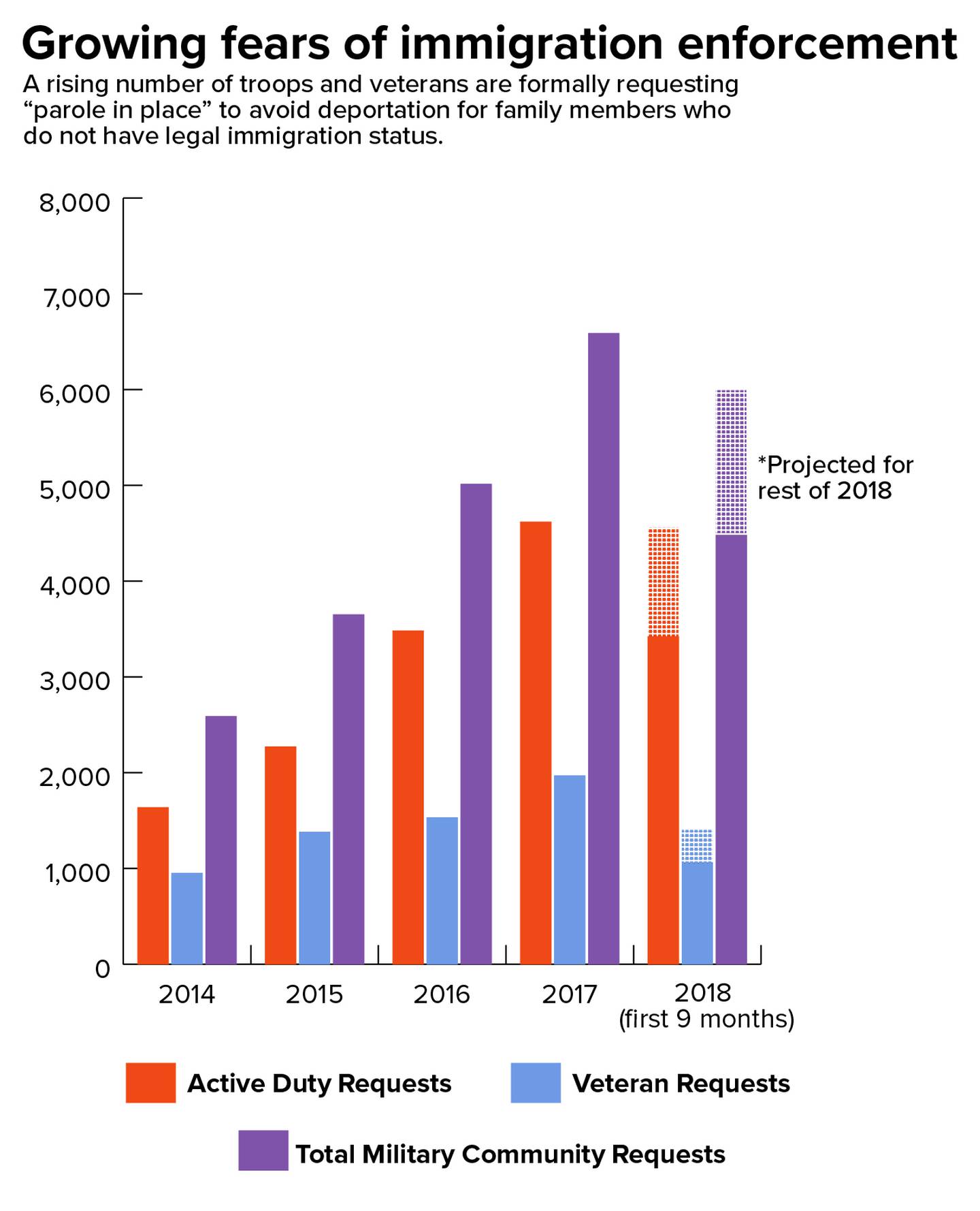 Parole in Place requests from both active duty and veteran service members spiked 31 percent from the last year of the Obama administration to the first year of Trump’s presidency, to 6,586 applications in 2017, as the new president directed the Department of Homeland Security to increase the number of deportations it processed. However most Parole in Place decisions take months or years to get approved and often are not decided in the same year as they are applied for.