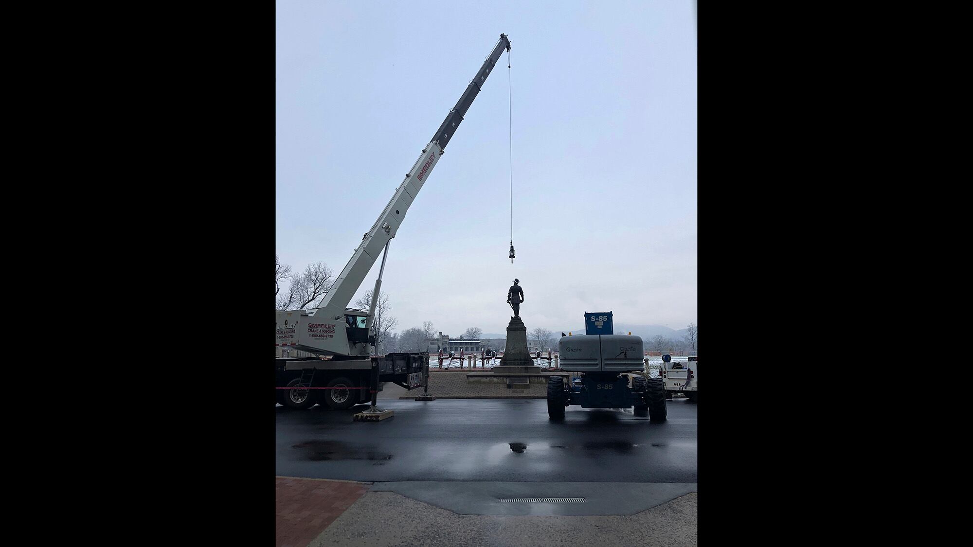 Around 9:45 a.m., a crane plucked the larger-than-life statue that freshmen were once required to salute off its base and slowly hoisted it to the ground. A small crowd gathered quietly on the mostly empty campus in Lexington where Jackson once taught, quietly looking on amid flurries of snow.