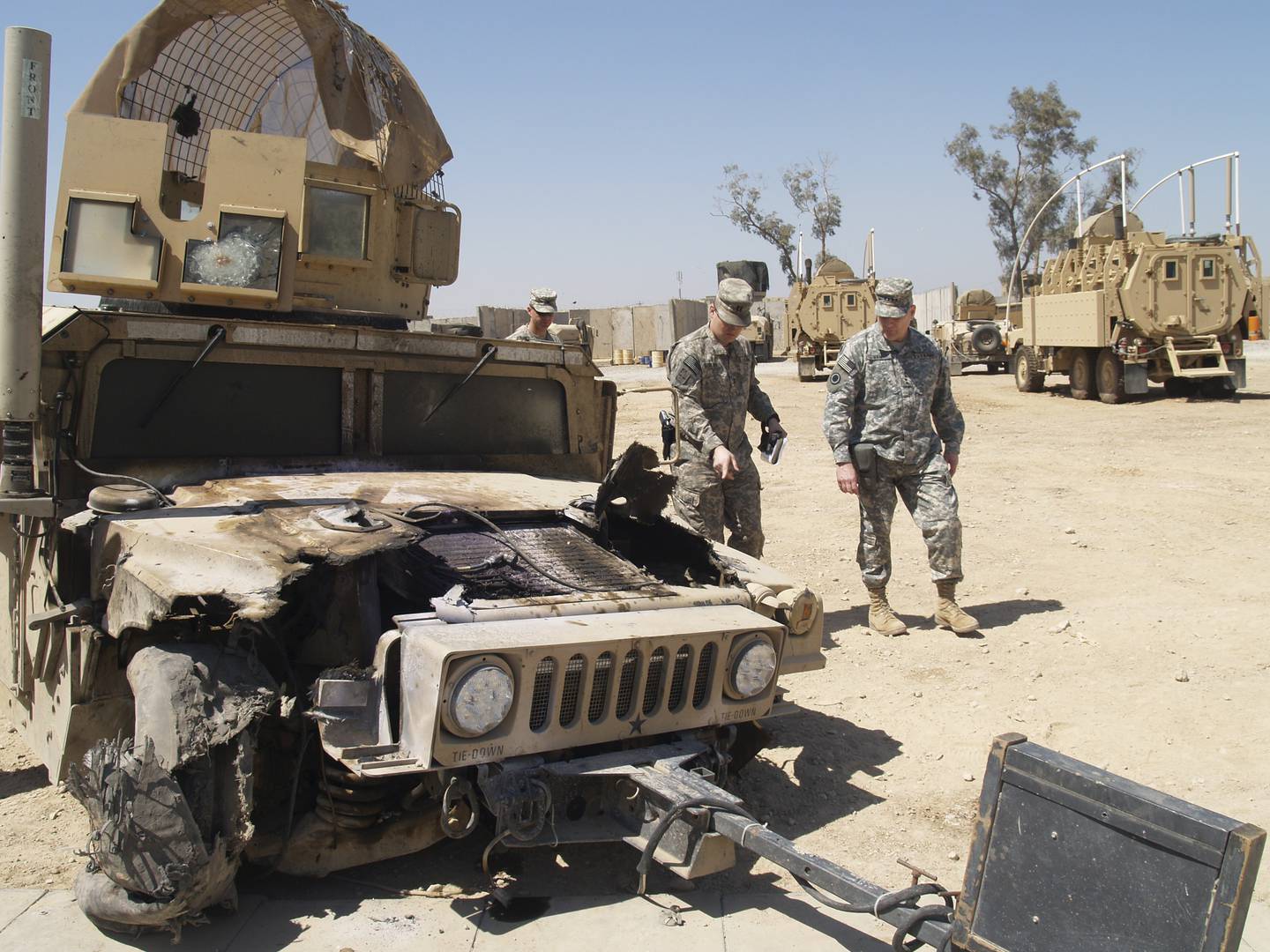 U.S. soldiers inspect a humvee damaged in 2009 by an improvised explosive in Iraq.