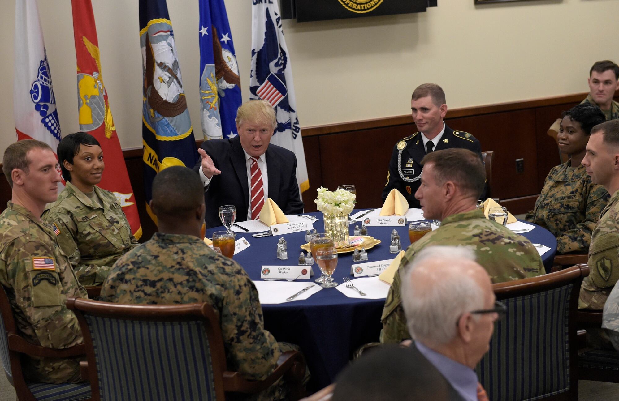 President Donald Trump has lunch with troops while visiting U.S. Central Command and U.S. Special Operations Command at MacDill Air Force Base, Fla., Monday, Feb. 6, 2017. Trump, who spent the weekend at Mar-a-Lago, stopped for a visit to the headquarters before returning to Washington.