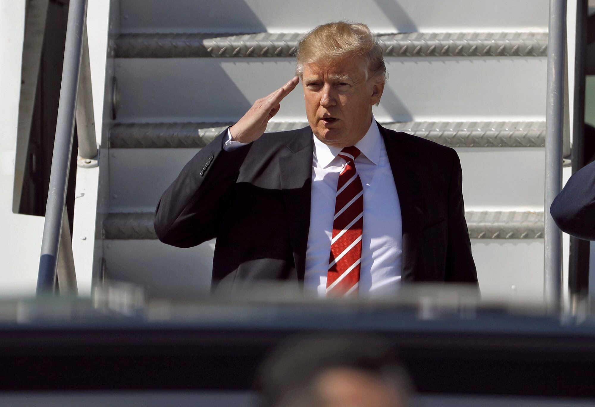 President Donald Trump salutes as he arrives on Air Force One at MacDill Air Force Base, Monday, Feb. 6, 2017, in Tampa, Fla.