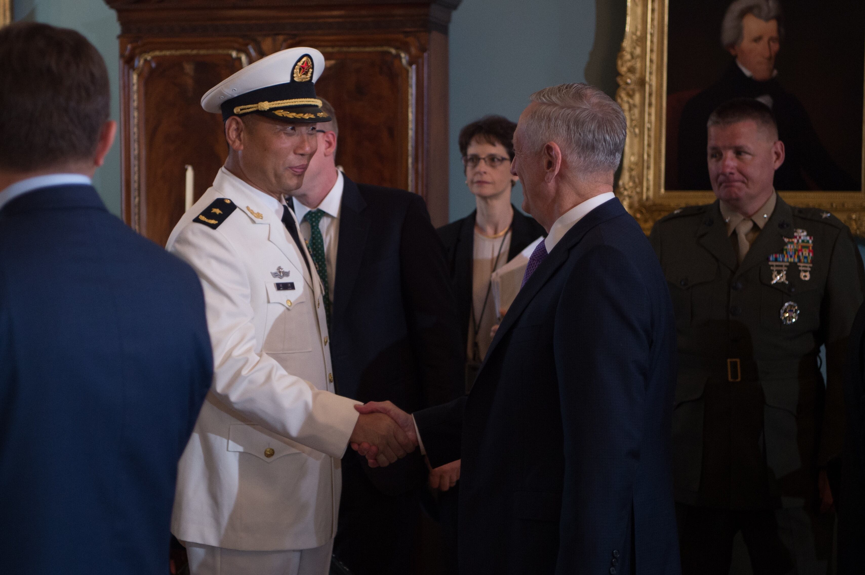 Defense Secretary Jim Mattis speaks to Rear Admiral Wei Gang, The Deputy Commander of People's Liberation Army Eastern Theater and Navy Commander of East Sea Fleet, before a U.S. – China diplomatic and security dialog in the Jefferson Room at the State Department in Washington, D.C., June 21, 2017