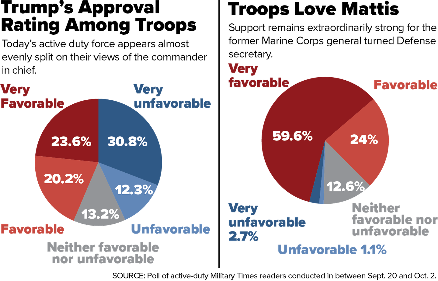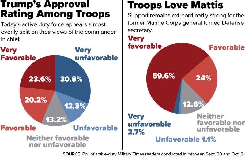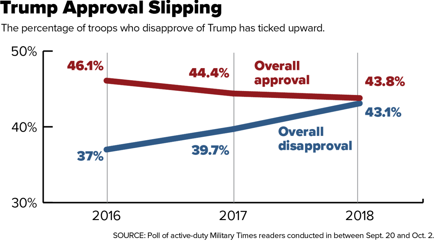 The results from the survey, conducted over the course of September and October, suggest a gradual decline in troops’ support of Trump since he was elected in fall 2016, when a similar Military Times poll showed that 46 percent of troops approved of Trump compared to 37 percent who disapproved. That nine-point margin of support now appears gone.