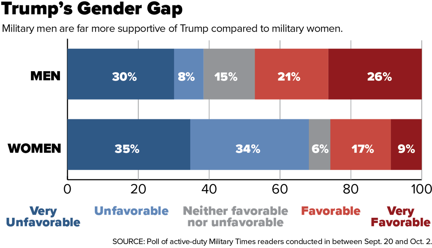 A CNN poll released earlier this month put Trump’s disapproval rating among women at 62 percent. In the Military Times poll, that figure topped 68 percent, with only about 26 percent of military women expressing a favorable view of the president.