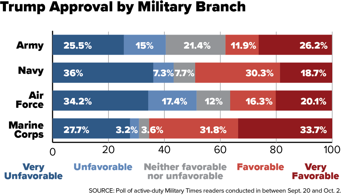 Among military men, Trump still enjoys a 47 percent favorable rating and a 38 percent disapproval mark.