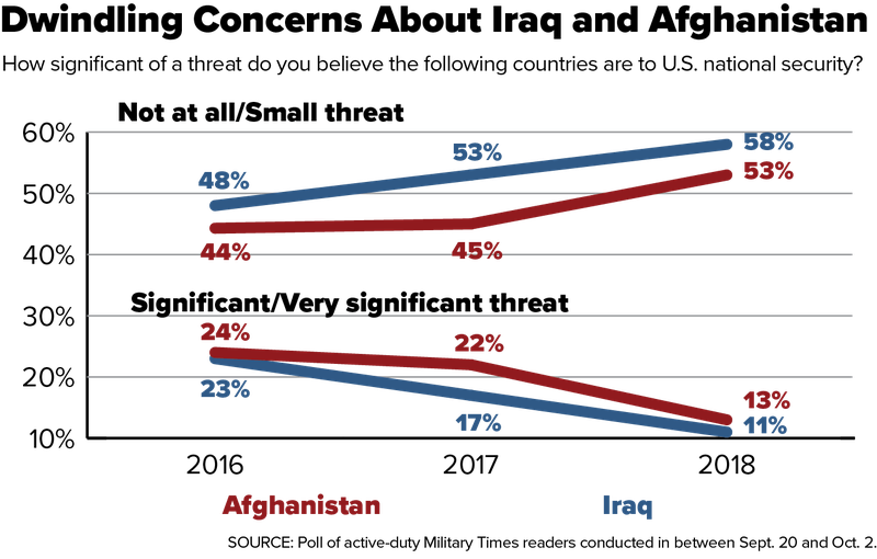 Even with U.S. forces still deployed to Iraq and Afghanistan — or perhaps because of it — those countries were seen as a significant threat by less than 13 percent of the armed forces. That’s well behind Iran (41 percent), Syria (24 percent) and Saudi Arabia (18 percent).