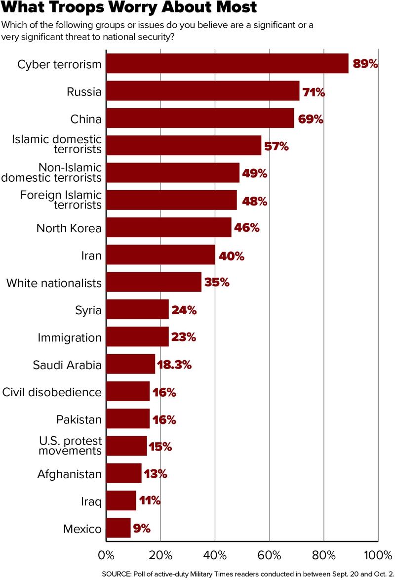 Cyber-terrorism topped the list of threats to U.S. security in the Military Times poll. Nearly 89 percent of those surveyed listed it as a significant threat, with more than half of those calling it a major concern.