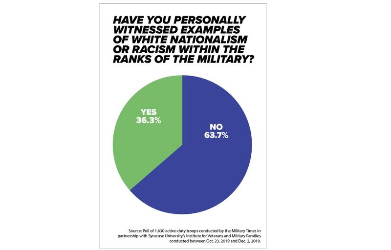 More than one-third of all active-duty troops and more than half of minority service members say they have personally witnessed examples of white nationalism or ideological-driven racism within the ranks in recent months, according to the latest survey of active-duty Military Times readers.