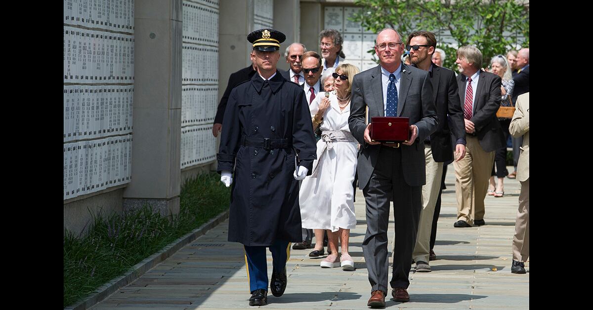 A military honor guard presented Pyle's widow with a folded American flag before she placed her husband's ashes in the wall. Six soldiers fired three volleys of rifle shots.