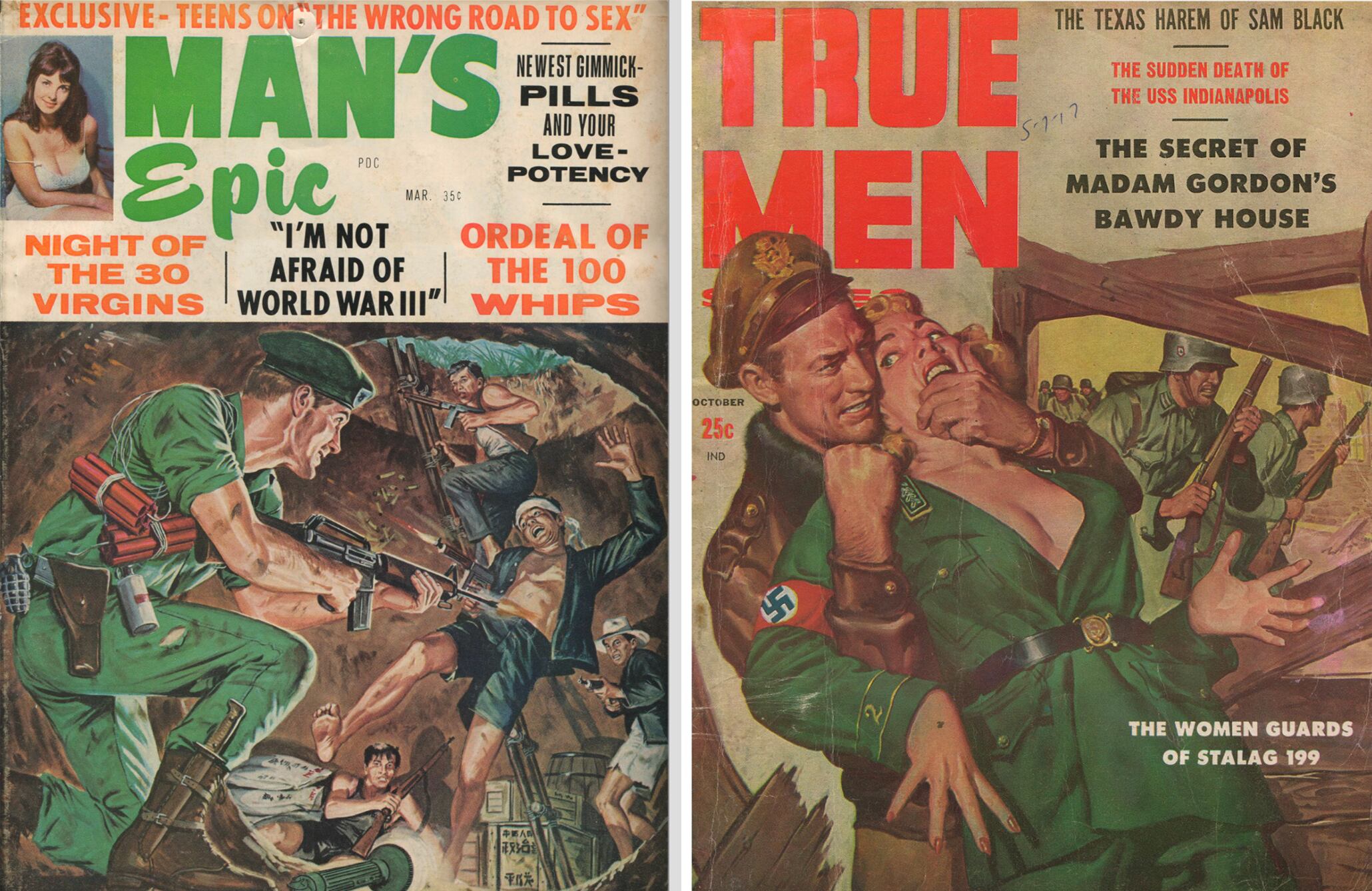 Such graphic illustrations were accompanied by titles like “Battle Cry,” “True Man,” “Man’s Epic,” and “Man’s Adventure,” and featured sensationalized phrasing such as “I’m Not Afraid of World War III,” “Night of the 30 Virgins,” and “The Nympho Spy Who Helped to Lose the War.”