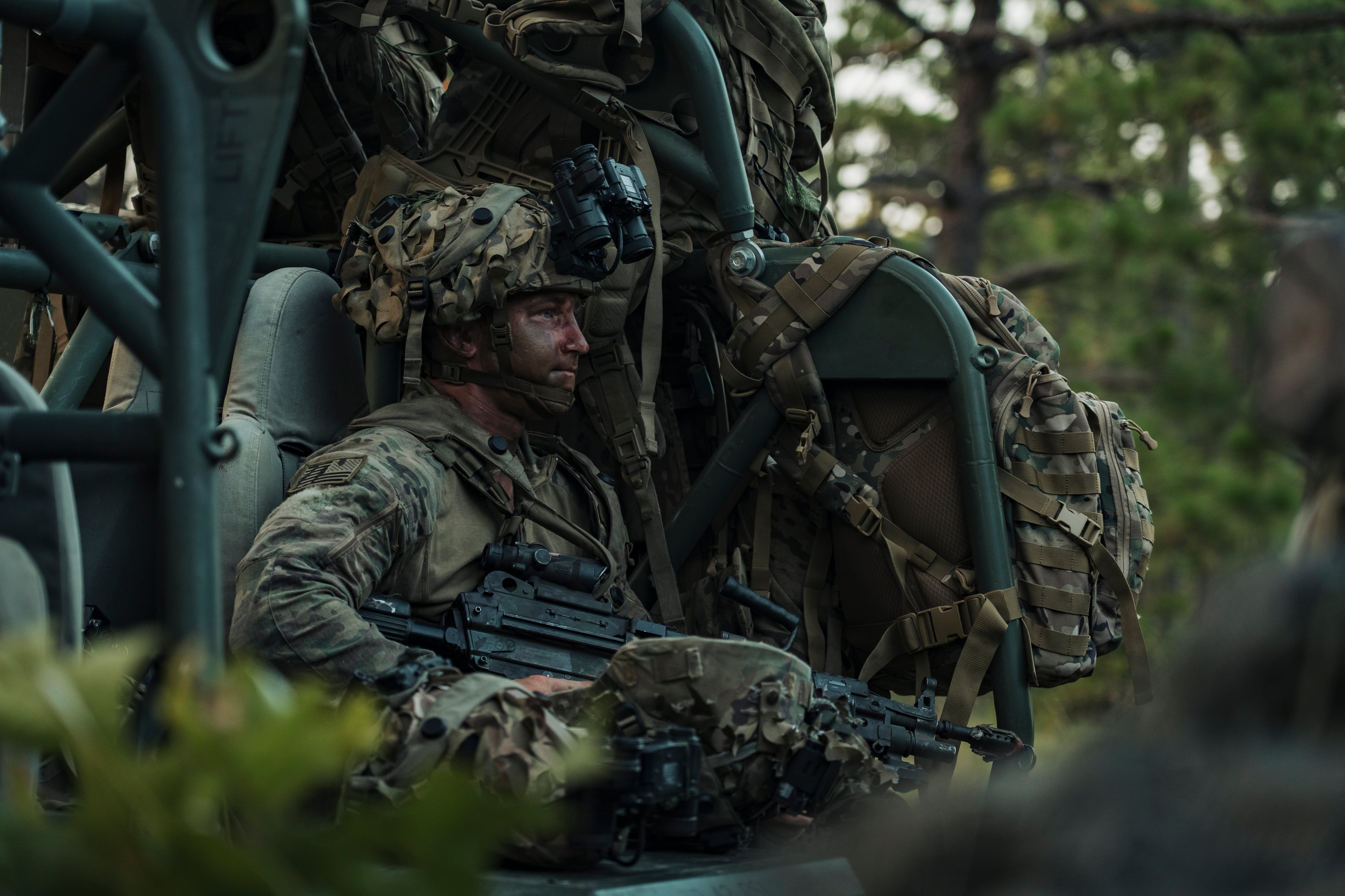 A paratrooper rides in an Infantry Squad Vehicle to his team’s objective during Devil Avalanche at Fort Bragg, North Carolina. (Spc. Aiden O’Marra/U.S. Army)