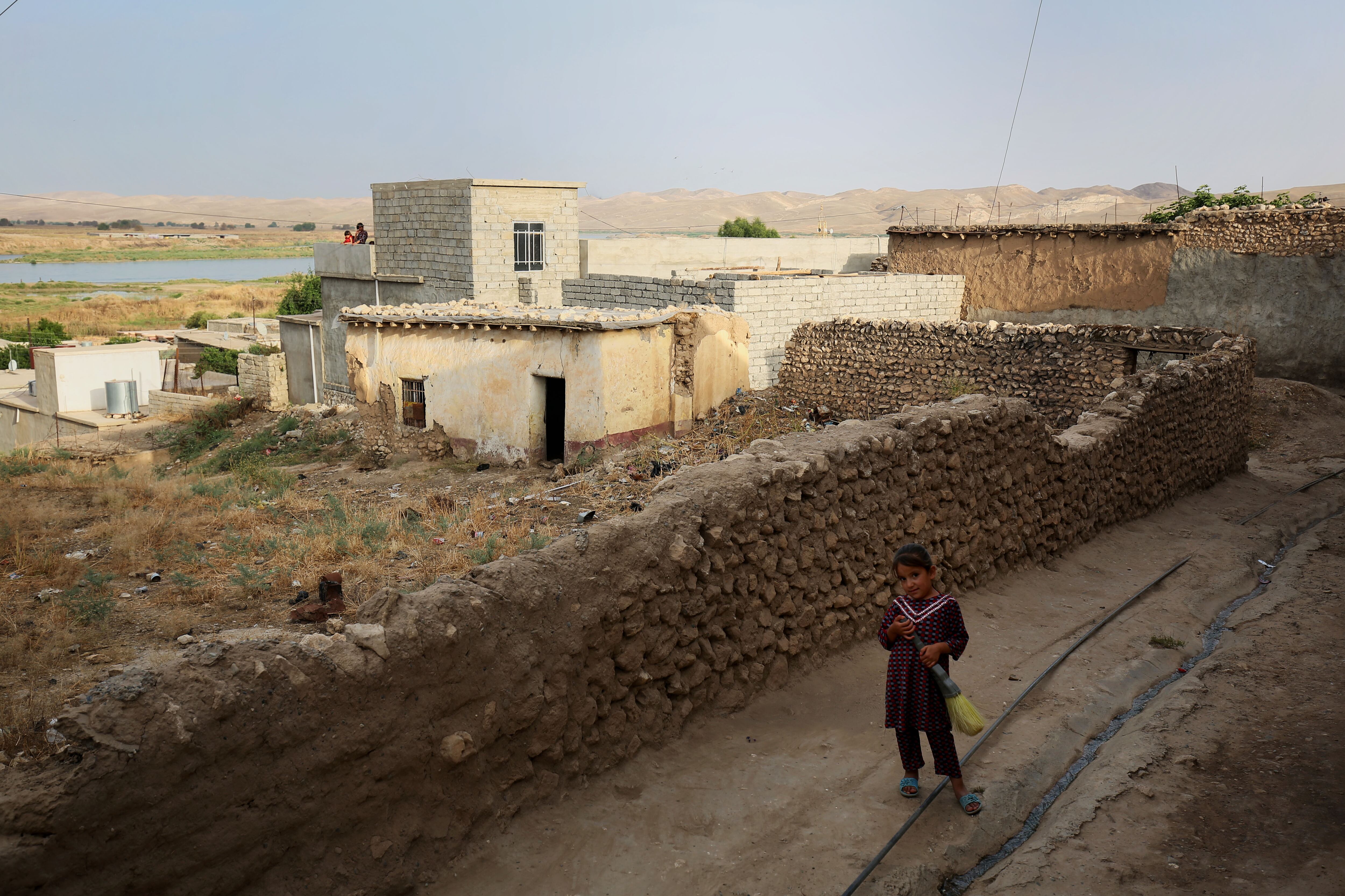 In this May 27, 2015, photo, a girl holds a broom in the town of Eski Mosul, Iraq, which had been under the control of the Islamic State group for months. Most residents stayed in the town after it was liberated by Kurdish Peshmerga forces in January 2015.