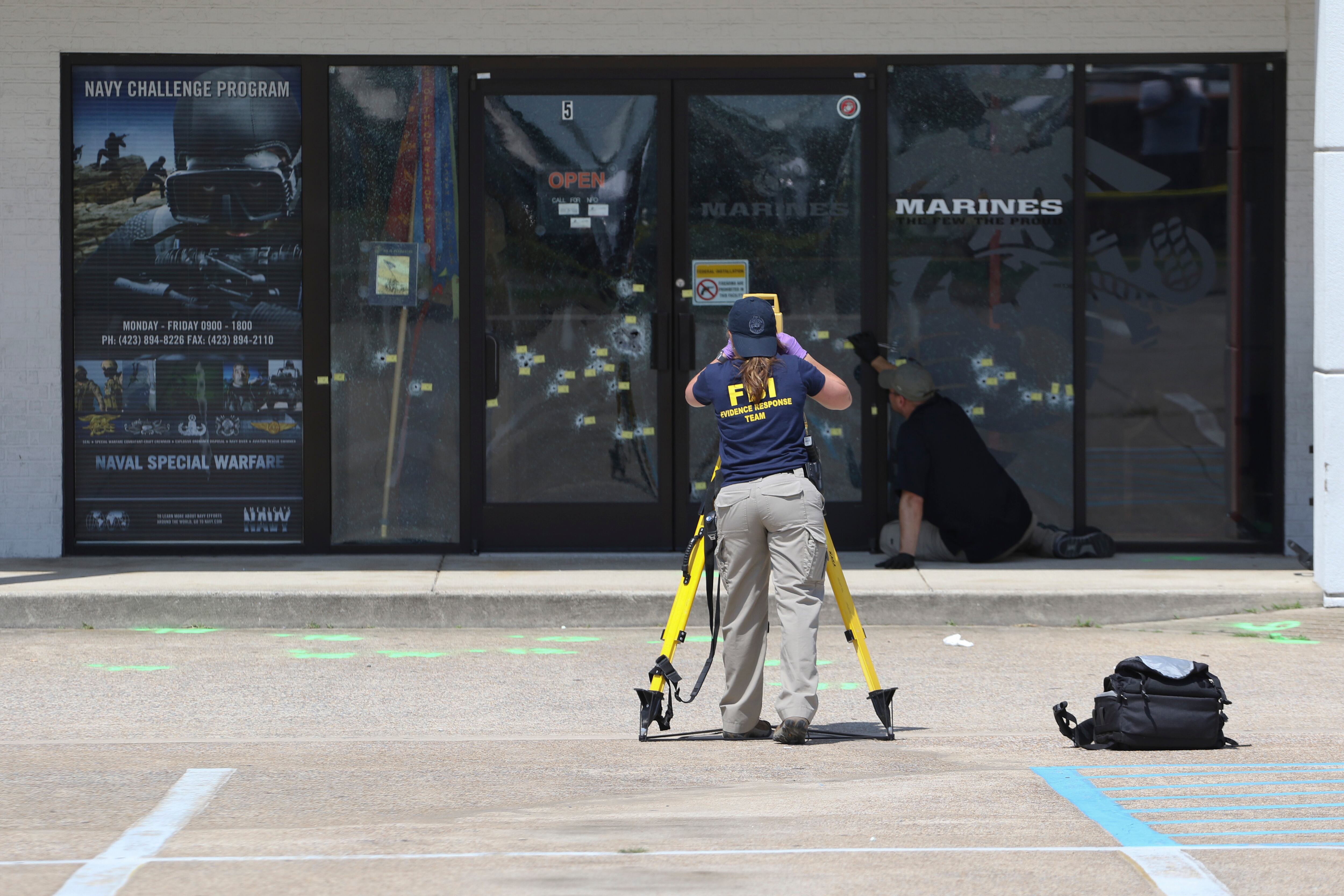The shooter, identified by the FBI as Mohammod Youssuf Abdulazeez, first fired about 30 rounds into an Armed Forces recruiting center about seven miles away before leading police on a high-speed car chase to the Reserve Center. Police engaged Abdulazeez in a 20-minute firefight that resulted in the shooter's death, according to the Times Free Press. It's unclear if Abdulazeez was killed by the police or his own hand.