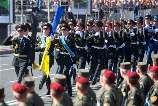 Speaking during a military parade, President Petro Poroshenko said Ukraine must not be complacent even though hostilities have largely died down. In a show of force, thousands of Ukrainian servicemen marched in downtown Kiev on to mark the country's independence from the Soviet Union on Aug. 24, 1991.