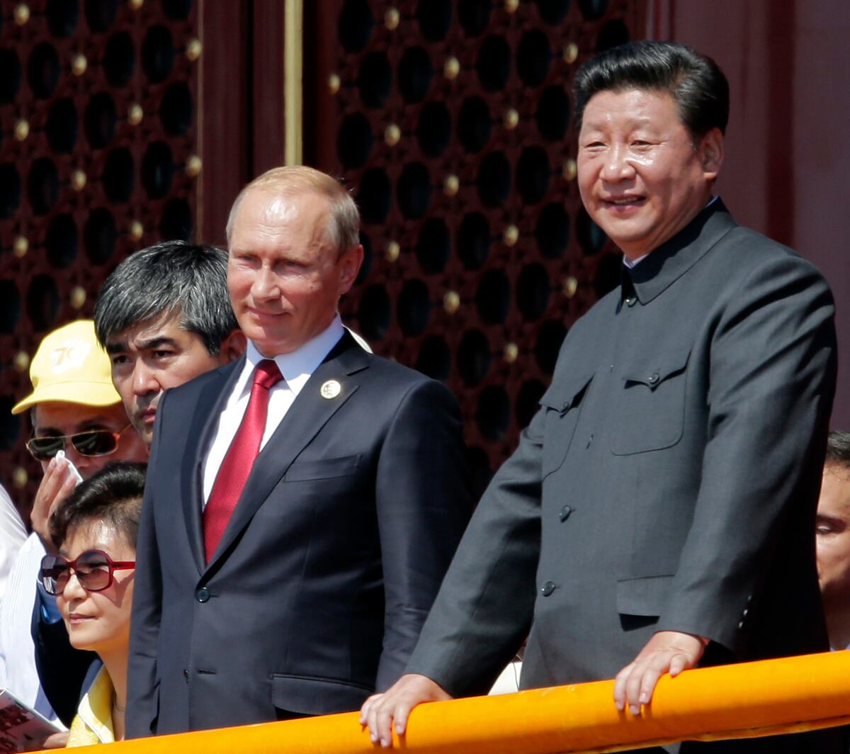 FILE - In this Sept. 3, 2015 file photo, Chinese President Xi Jinping, right, Russian President Vladimir Putin, center, and South Korean President Park Guen-hye, seated left, observe a parade commemorating the 70th anniversary of Japan's World War II defeat, from Tiananmen Gate in Beijing. As Xi makes his first state visit to Washington this week, the outlook for relations is decidedly murkier than when he hosted President Barack Obama at their last summit less than a year ago. Xi presided over the massive military parade that showcased the growing might of the People’s Liberation Army. However, while a few luminaries such as Putin and U.N. Secretary-General Ban Ki-moon attended, most leaders of the world’s major democracies stayed away, with the U.S. sending only its Beijing ambassador. (AP Photo/Ng Han Guan, File)