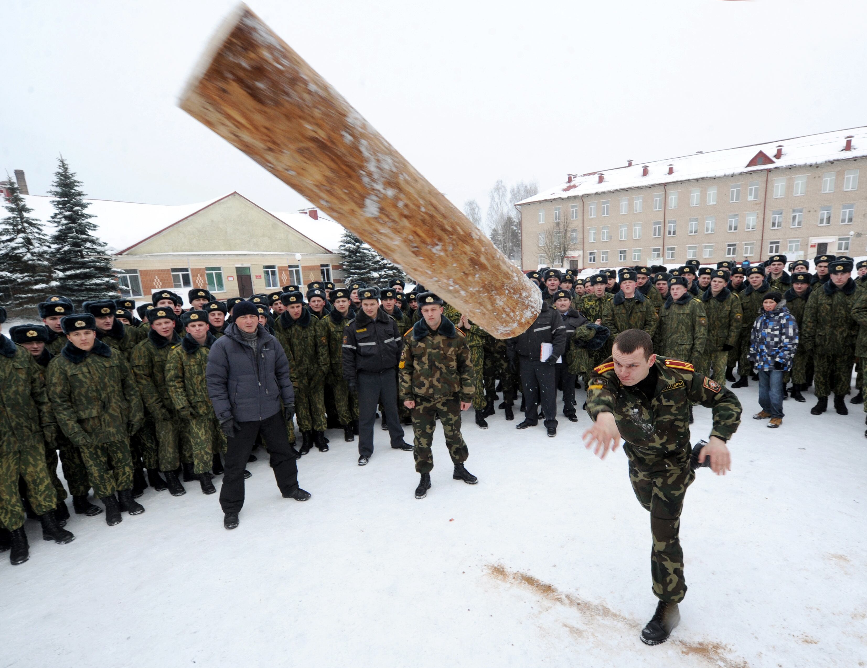 Belarus Interior Ministry serviceman throws a beam as he takes part in a competition to mark the Defenders of Fatherland Day at their training center near the village of Okolitsa some 30 km outside Minsk, on February 23, 2013. Belarus alongside with some countries of former USSR markes the Defenders of Fatherland Day on February 23. AFP PHOTO/VIKTOR DRACHEV (Photo credit should read VIKTOR DRACHEV/AFP/Getty Images)