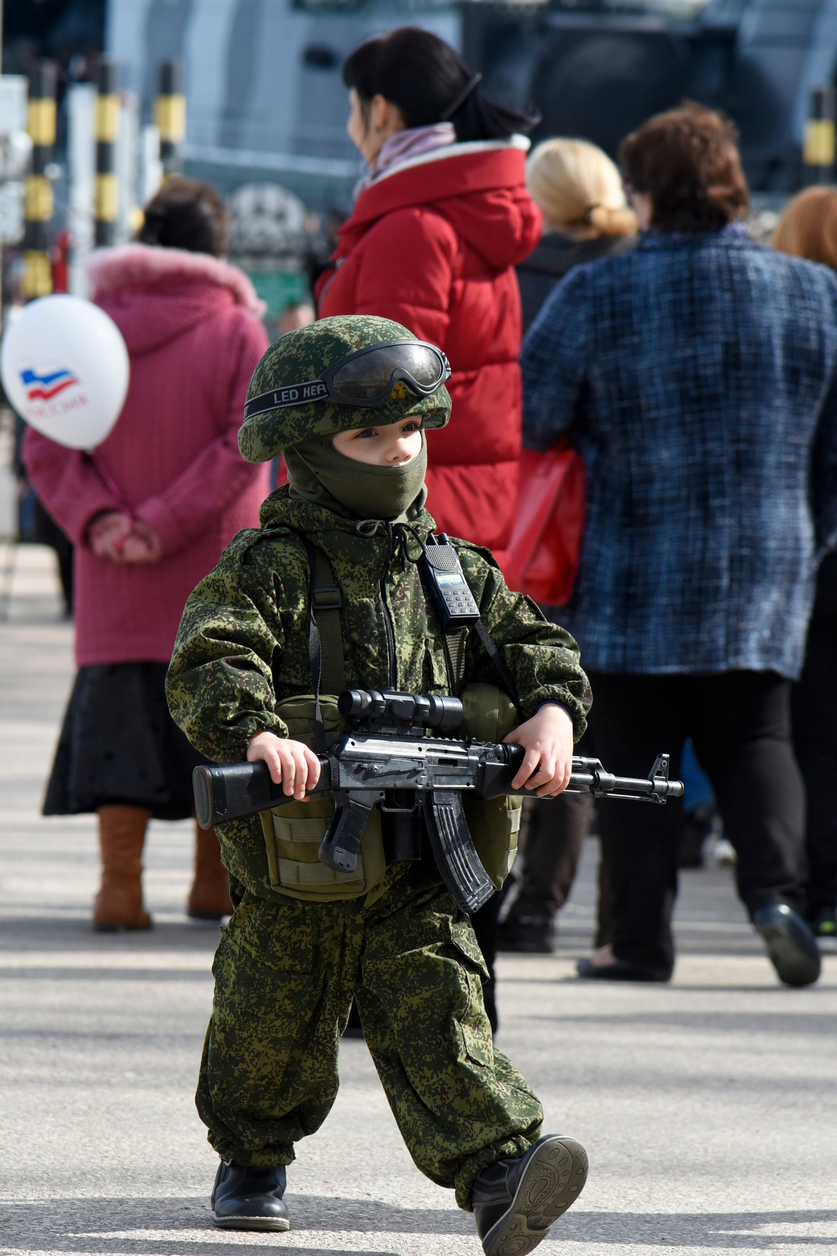 A boy dressed in a military uniform marches holding a toy Kalashnikov machine gun in Sevastopol, Crimea, Tuesday, Feb. 23, 2016, during the celebrations on the Defenders of the Fatherland Day. (AP Photo/Alexander Polegenko)