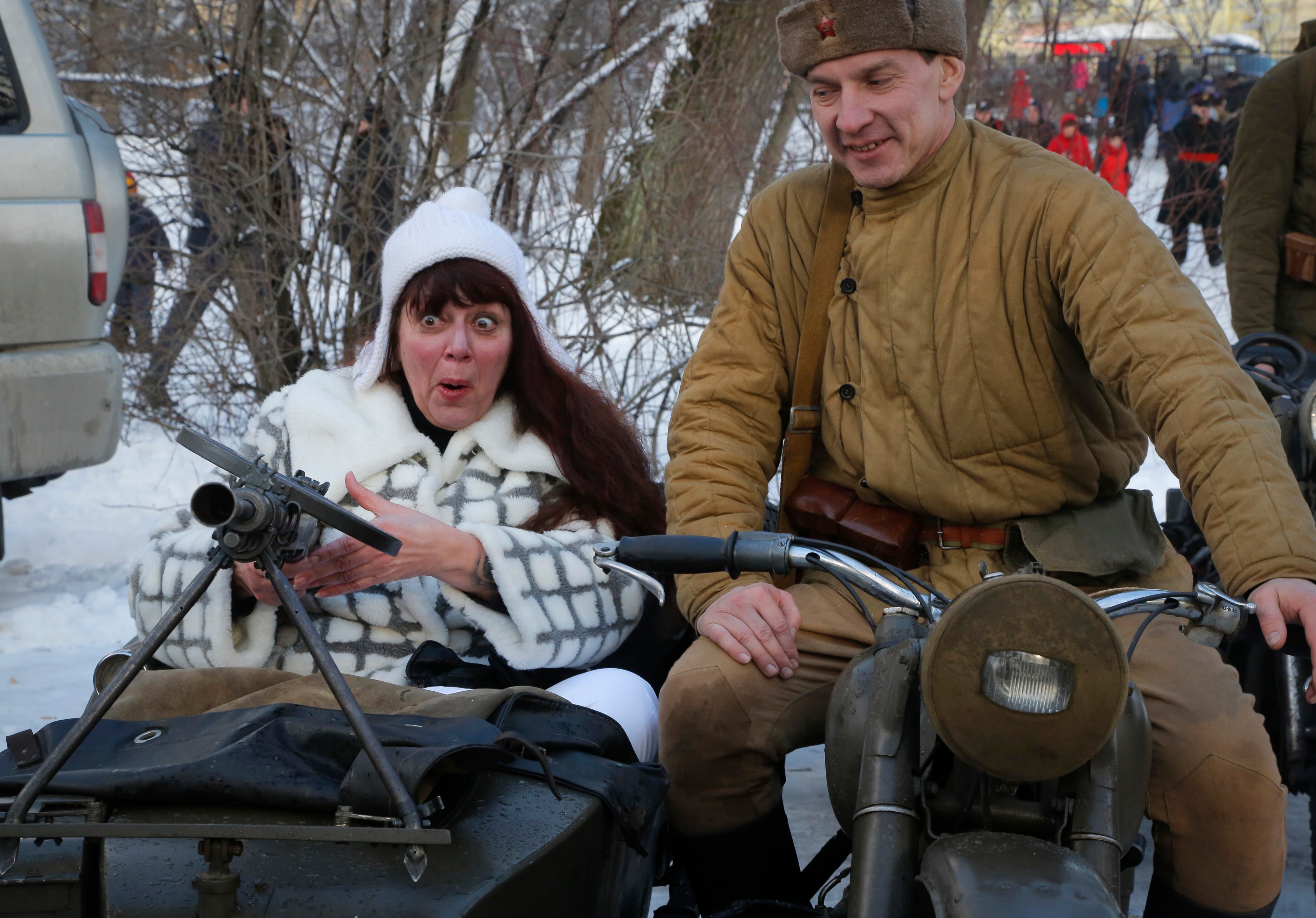 Members of historical military clubs wearing Soviet army, right, and Nazi German uniform participate in the World War II battle reconstruction during celebration of the Defenders of the Fatherland Day in St.Petersburg, Russia, Tuesday, Feb. 23, 2016. The day, celebrated in Russia on Feb. 23, honors the nation's military and is a nationwide holiday. (AP Photo/Dmitri Lovetsky)