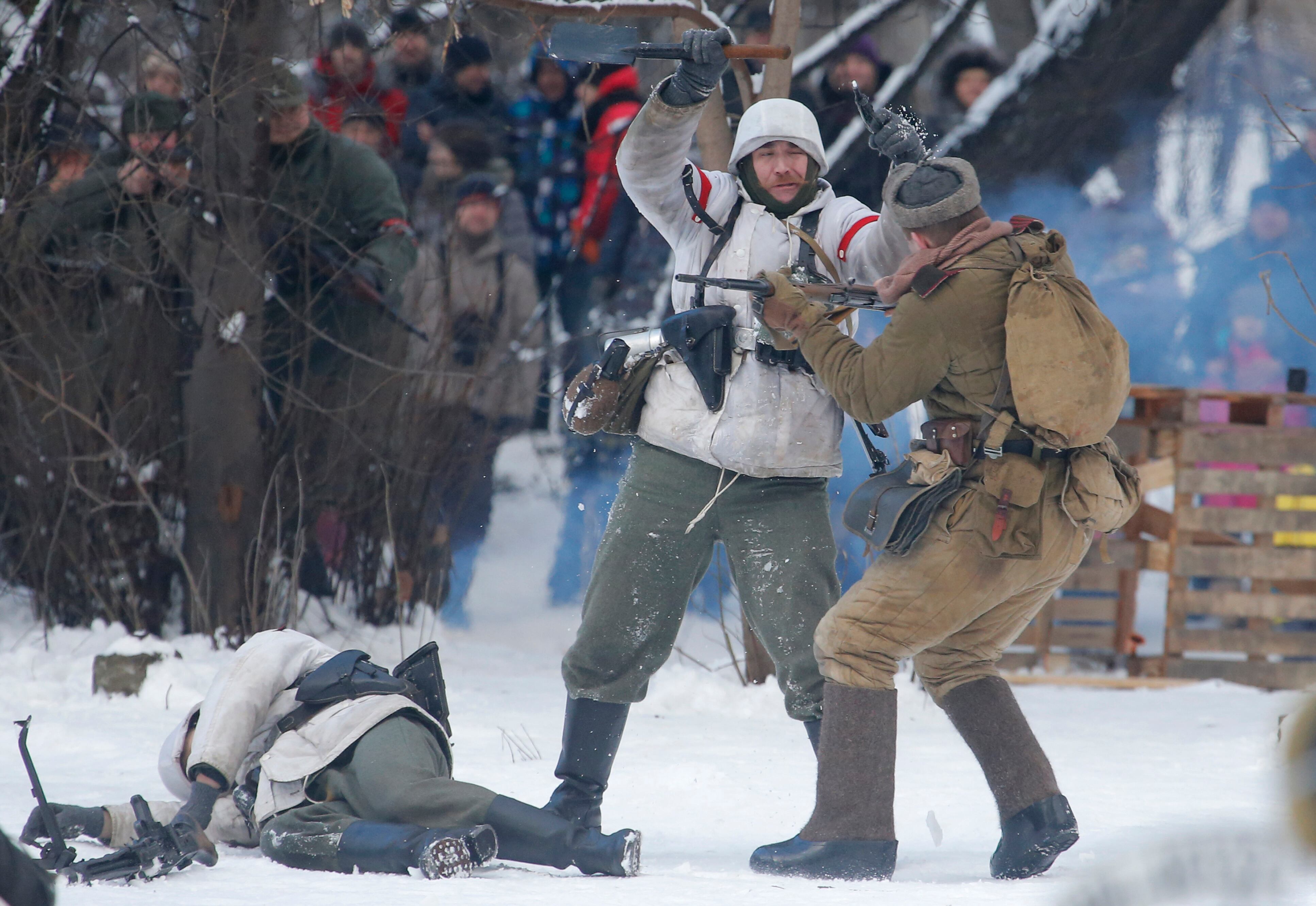 Members of historical military clubs wearing Soviet army, right, and Nazi German uniform participate in a World War II battle re-enactment Tuesday in St. Petersburg, Russia.