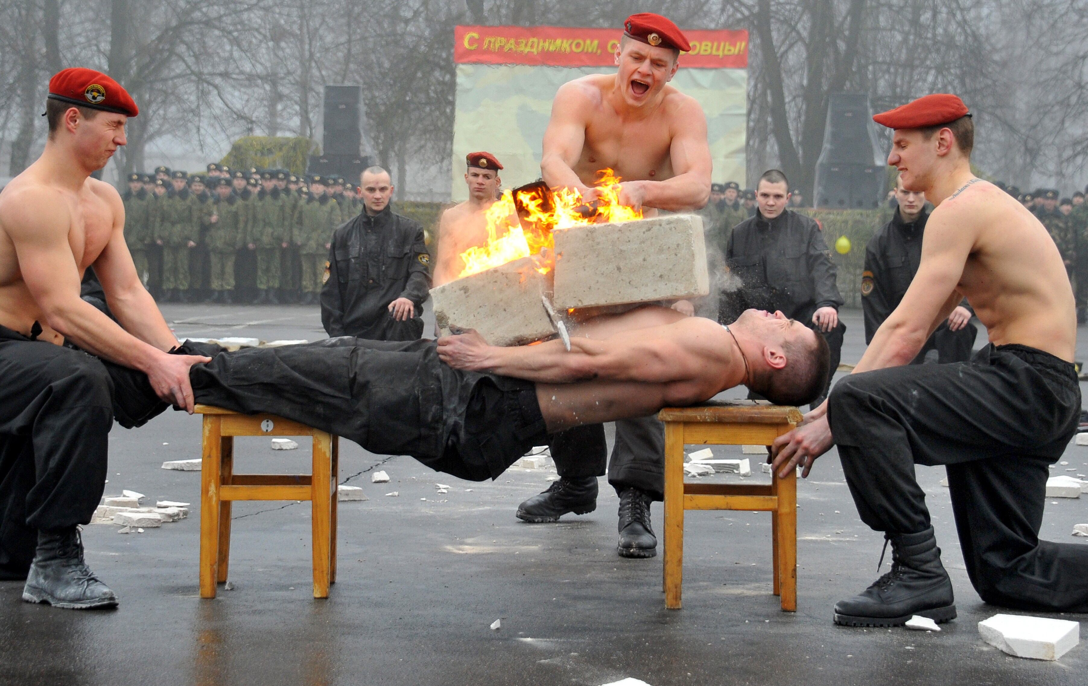 A Belarus Interior Ministry special forces soldier demonstrates his ability to sustain a blow during a competition to mark the Defenders of the Fatherland Day at their training centre outside Minsk, on February 23, 2014. Belarus alongside Russia and other countries of the former USSR celebrates the Soviet holiday on February 23 each year. Following the fall of the Soviet Union in 1991, the holiday was given its current name in 2002 by Russian President Vladimir Putin. AFP PHOTO/VIKTOR DRACHEV (Photo credit should read VIKTOR DRACHEV/AFP/Getty Images)