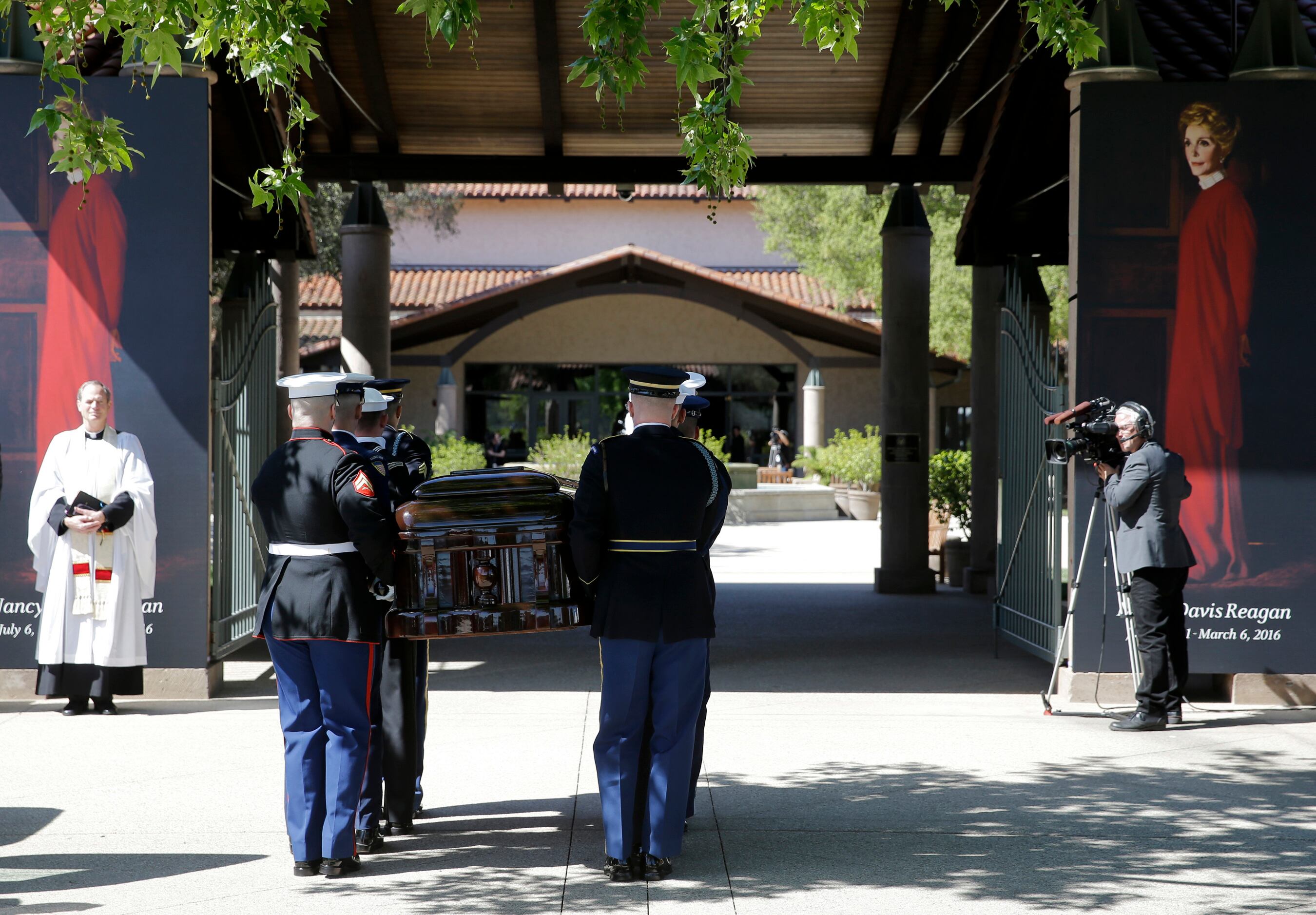 When the hearse arrived at the library, a military honor guard carried the casket between two identical towering portraits of the diminutive Mrs. Reagan wearing a long, red dress and then past a gurgling courtyard fountain. The casket was placed in a lobby behind a bronze statue of a smiling Ronald Reagan holding a cowboy hat.