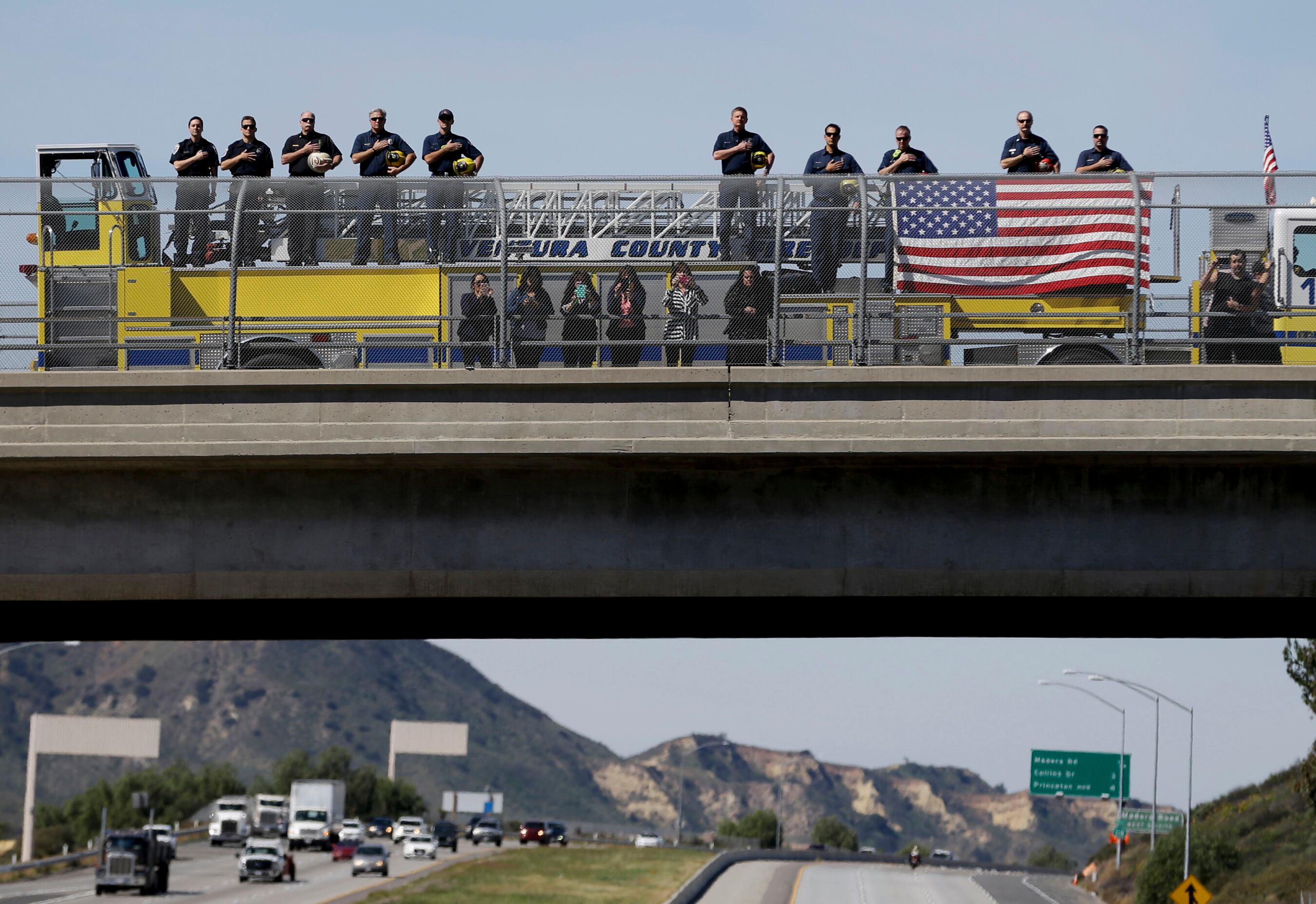 After turning onto the Ronald Reagan Freeway, the vehicle passed under the firefighters, who wore dress blues and saluted atop their trucks. Construction workers in hard hats, riders on horseback, parents holding children and other observers lined the roadside to watch and to snap photos with their cellphones.