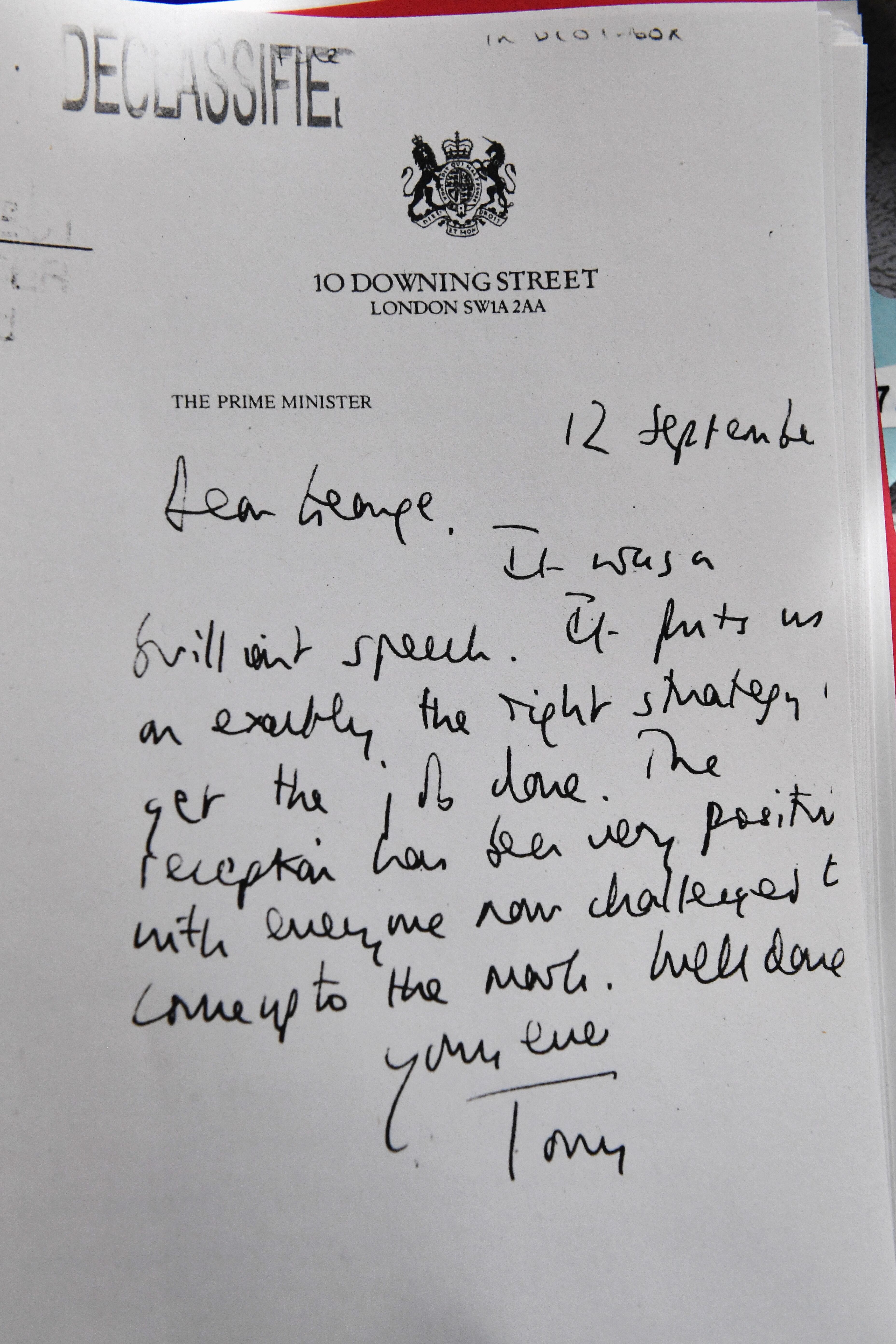 A detail of a declassified handwritten letter sent by the then British Prime Minister Tony Blair, to former U.S President George W. Bush, is seen as part of the Iraq Inquiry Report presented by Sir John Chilcot at the Queen Elizabeth II Centre in London, July 6.