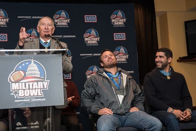 Groberg joined Navy Senior Chief Special Warfare Operator (SEAL) Edward Byers, who received his Medal of Honor in February 2016 for actions during a hostage rescue, alongside four other recipients of the valor award during a Tuesday gathering in Annapolis, Maryland, in connection with the Military Bowl presented by Northrop Grumman. The six men shared a podium and their stories with an audience of sponsors, VIPs and invited guests, including Command Sgt. Maj. John W. Troxell, the senior enlisted adviser to the Joint Chiefs of Staff who'd returned the night before from a USO tour to Iraq and has just served his second stint as the grand marshal of the bowl game's parade.