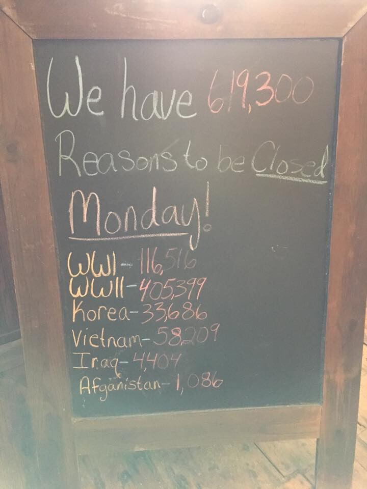 Restaurant manager Kelly Ray put out a sign in front of Mayberry's, a bar and grill in Washington, Kansas, on Memorial Day that read: "We have 619,300 reasons to be closed Monday!"