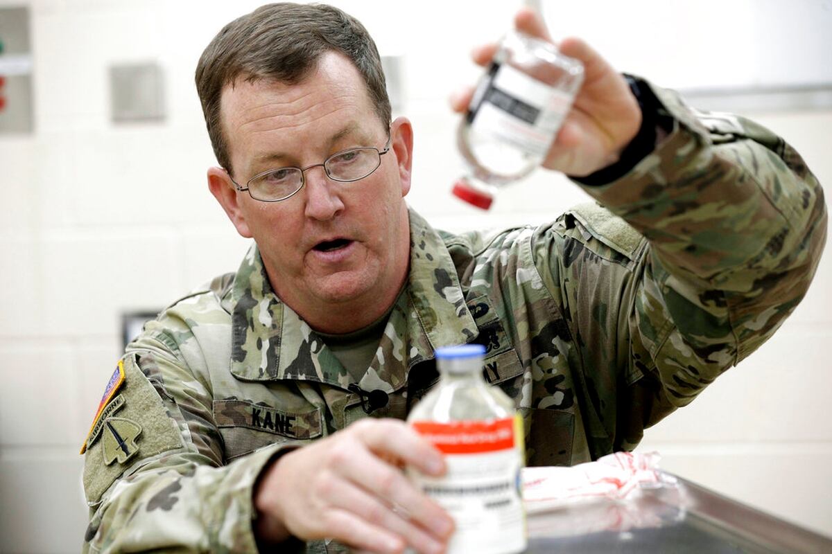 The plasma Anderson used was stored in a thick glass bottle and kept in a kit with IV lines and distilled water. The medic has to pour the water into the bottle, swirl it around and inject it. Before his injury, Hargis used to think the freeze-dried equipment took up too much room in the medic’s bag.
