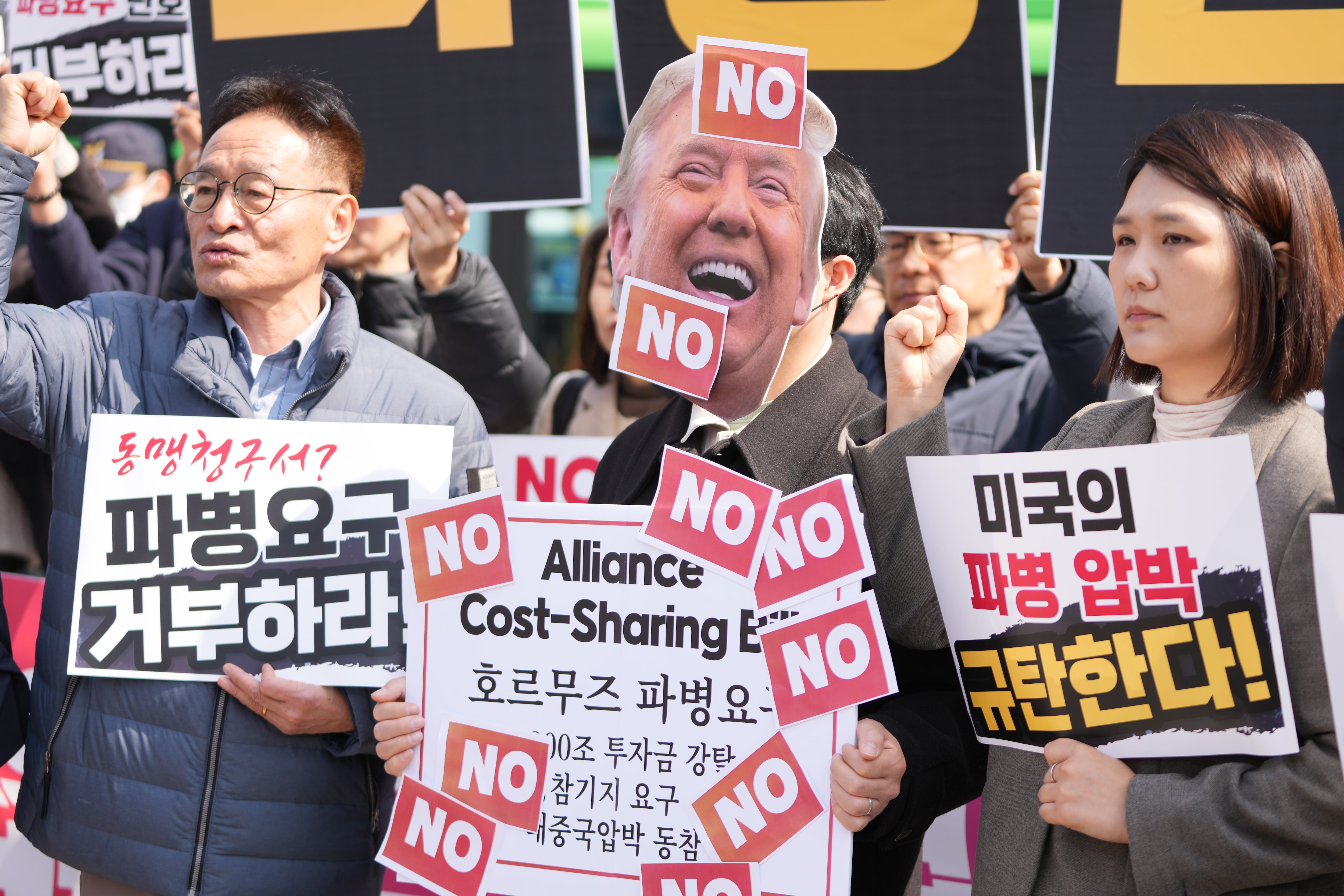 Protesters in Seoul, South Korea, shout slogans March 16 against Donald Trump's demands to multiple countries to send warships to keep the Strait of Hormuz open. (Lee Jin-man/AP)