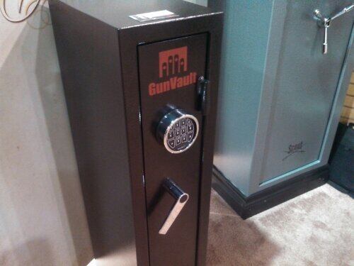 GunVault has a new safe to keep your home defense arsenal at the ready. The TacVault will hold your AR Style rifle with 30 round mag and a Tactical Shotgun. At 80lbs its sized right to fit in a closet and with bolts in the rear wall as well the floor it ain't going anywhere. The top shelf should hold enough ammo to hold off any trouble until reinforcements arrive. Electronic and biometric models are available at MSRPs of 449.99 and 549.99 respectively.
