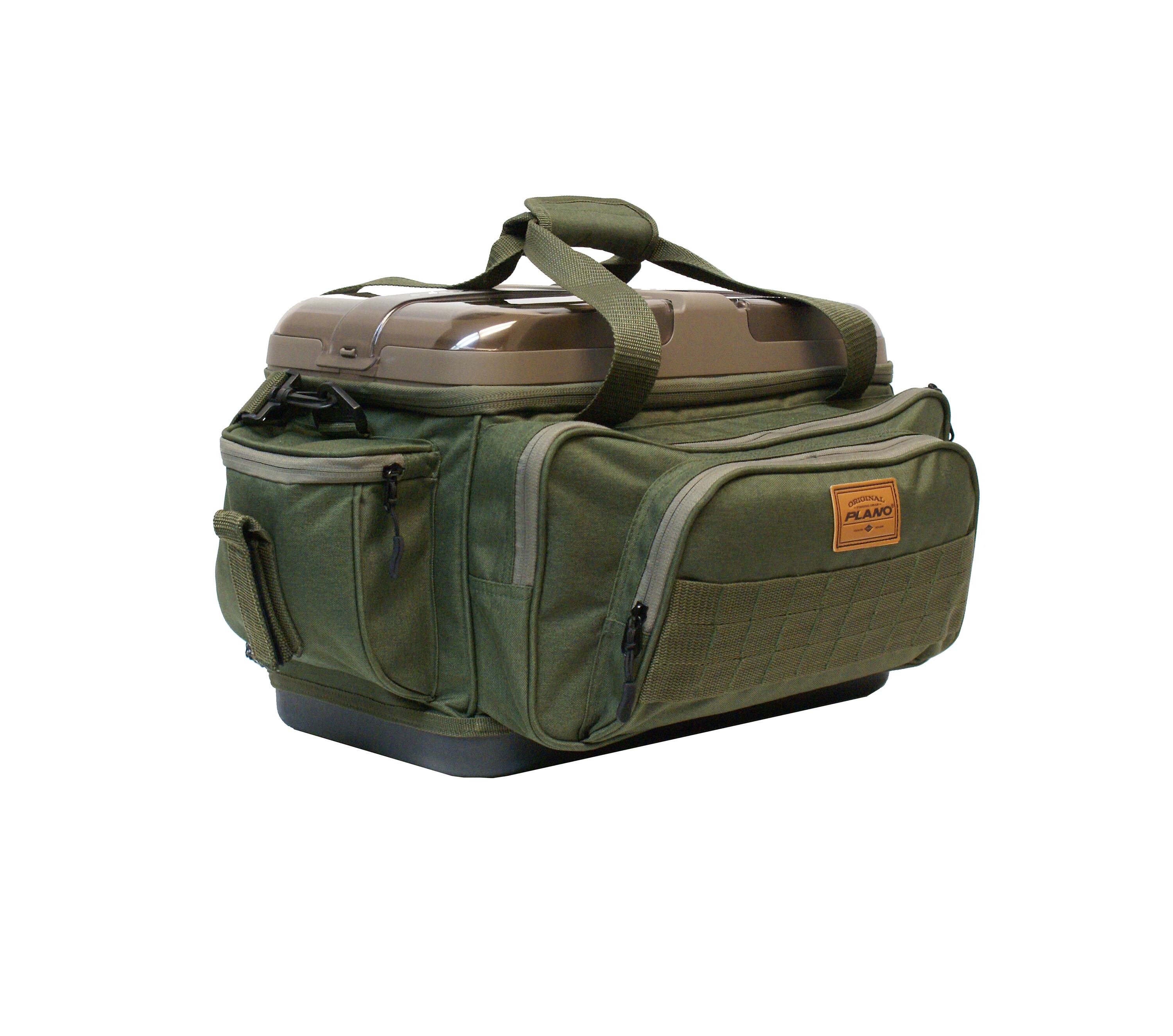 The hybrid soft/hard Plano A-Series Quick Top Tackle Bag's see-through plastic lid can hold mobile devices and favored lures for rapid access. Below is a soft tackle bag with reinforced handles and padded shoulder strap. $69.99 and $79.99