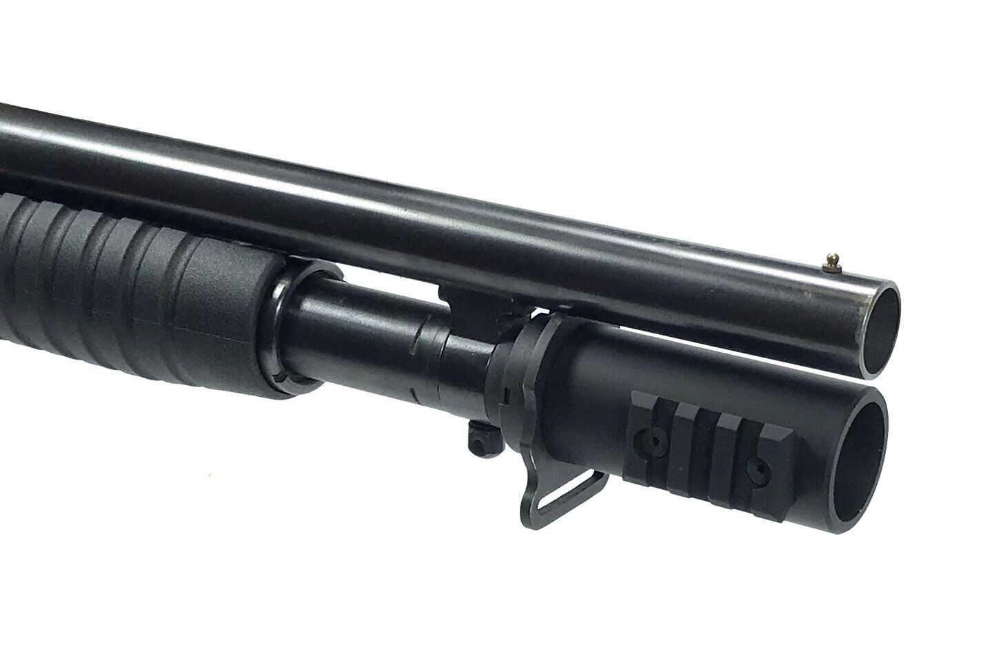 This sling and accessory mounting system has indexable Picatinny rail sections to add a light or laser as needed to the popular Mossberg model 500 shotgun.