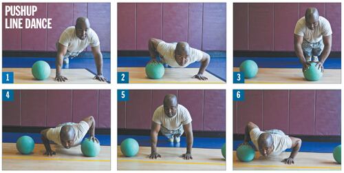 I tried the pushup "line dance," shown above, and could only make it 2/3 of the way down the line before collapsing in a pathetic heap. These circuits don't take much time, but you'll wish they were over quicker.