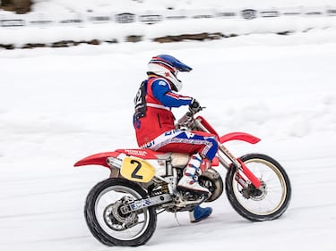 A vintage KTM in the snow and an open track with nobody tracking your time but yourself — sounds perfect. (Monti Smith)